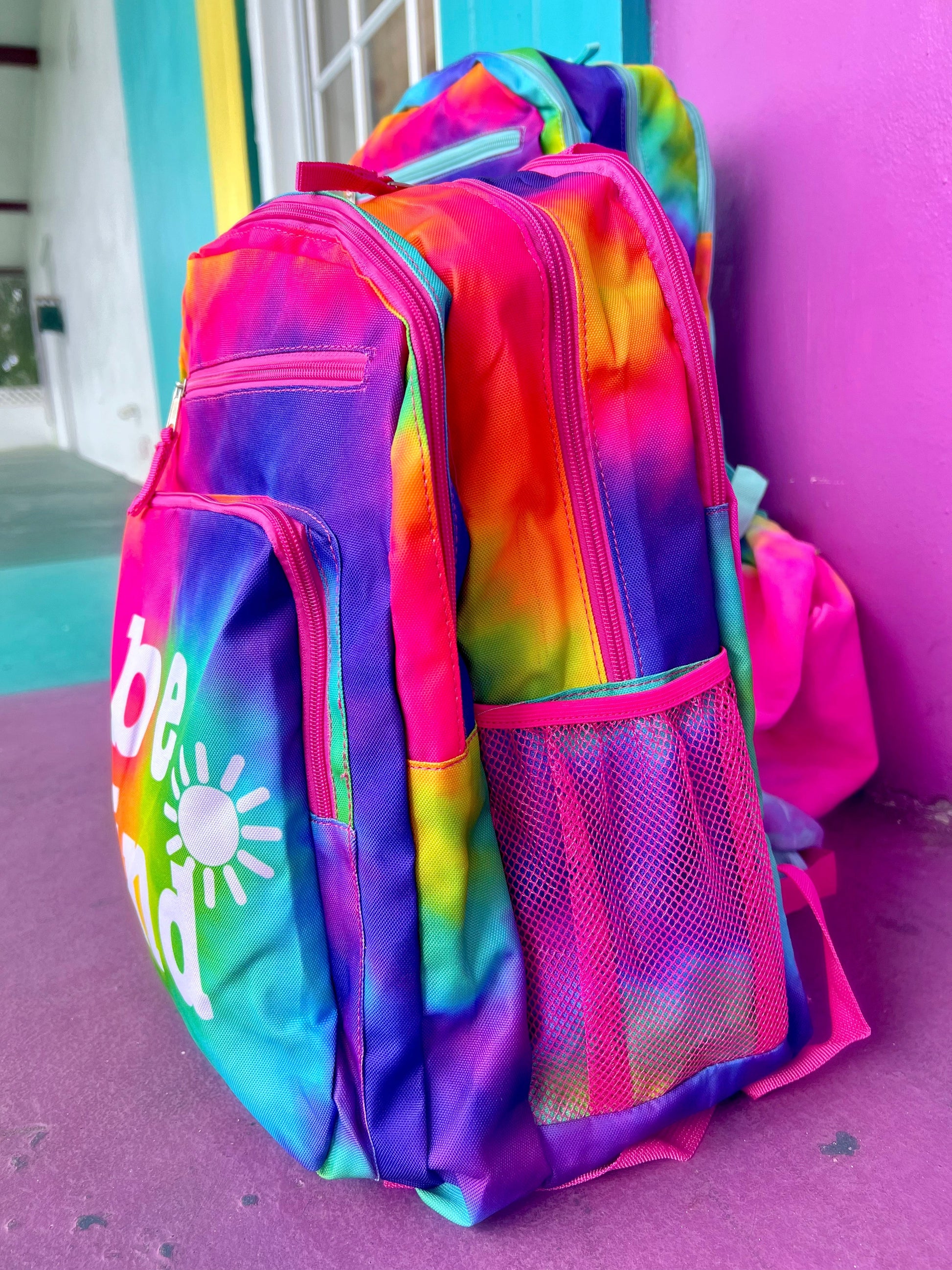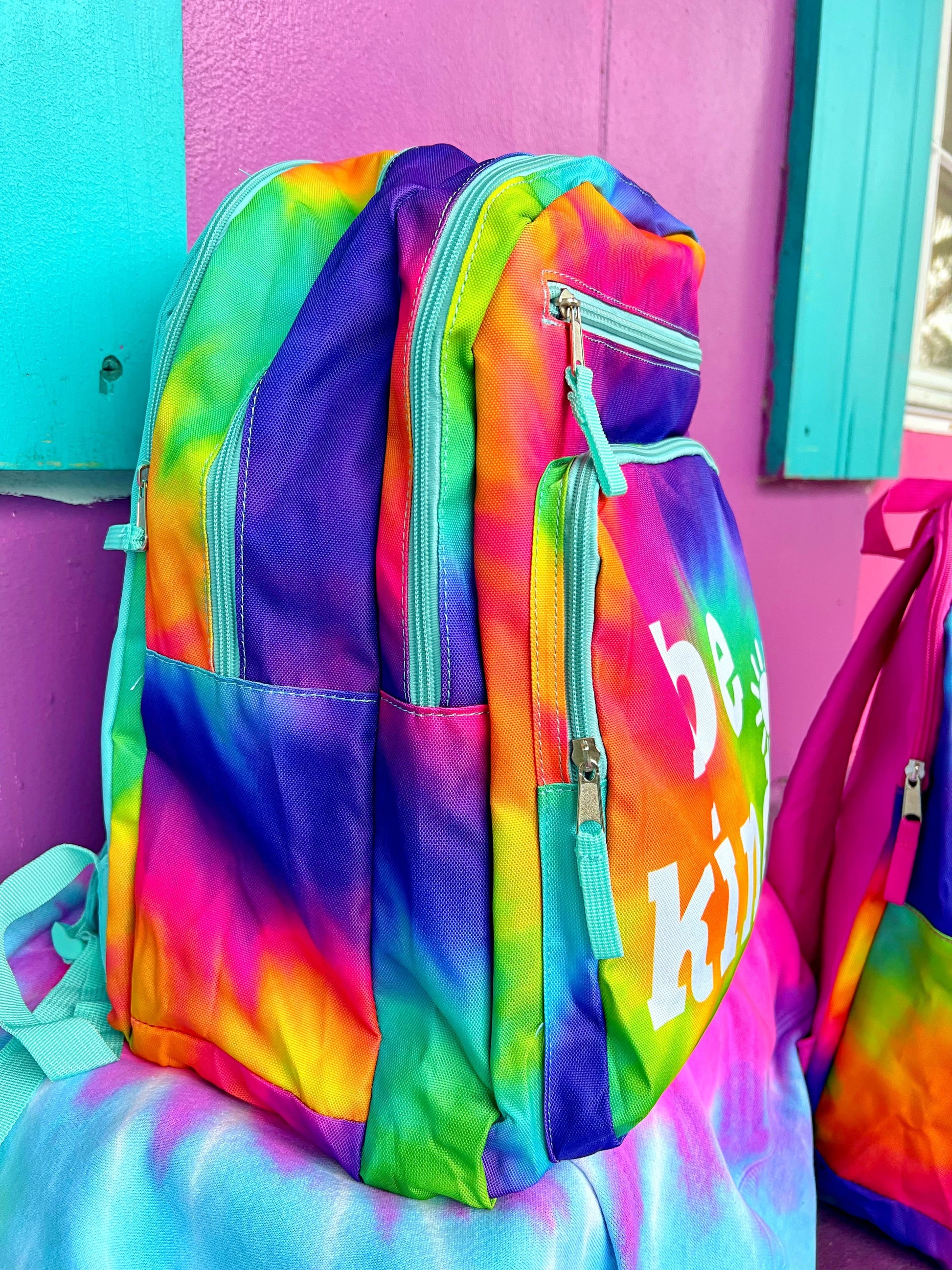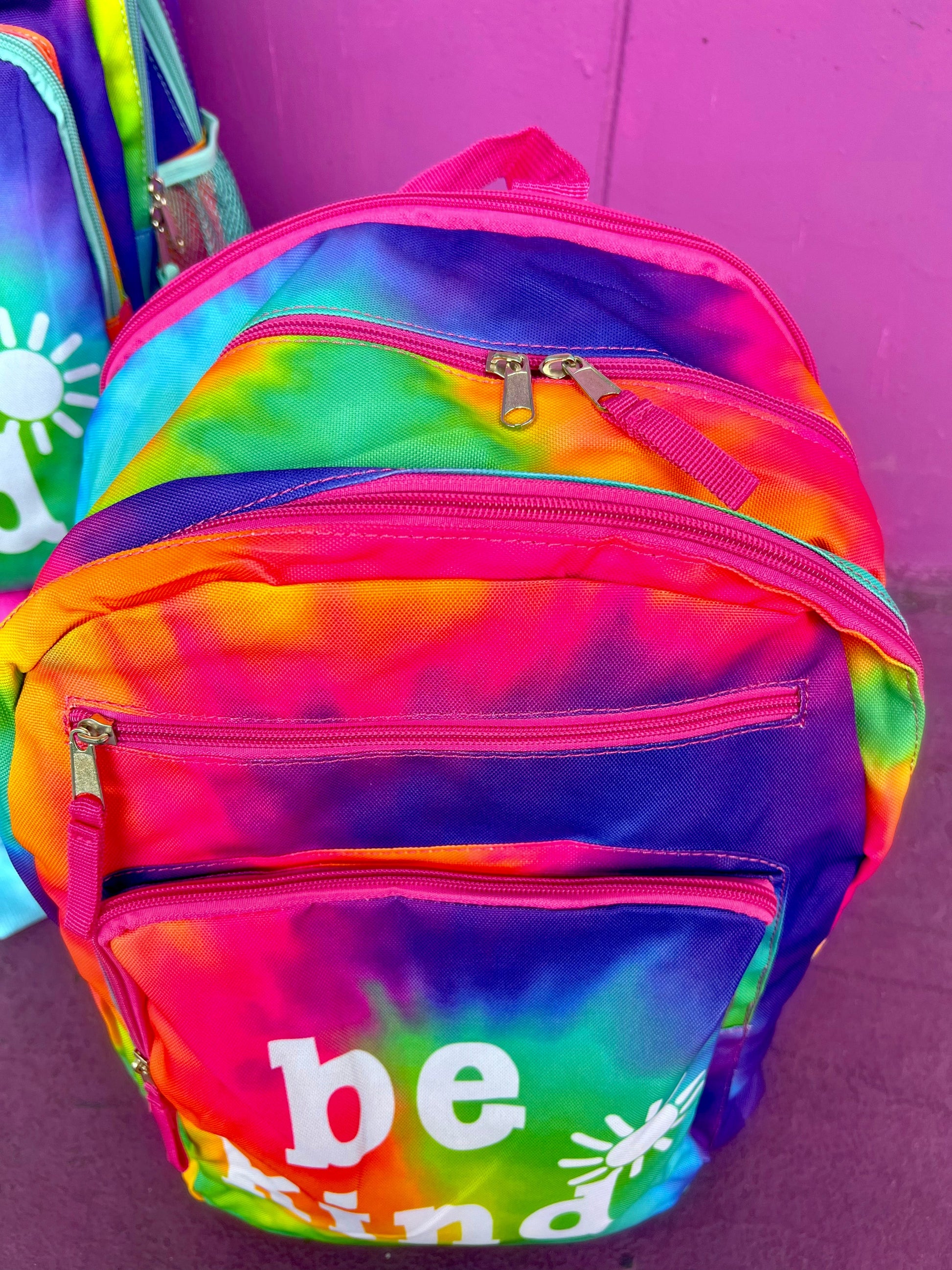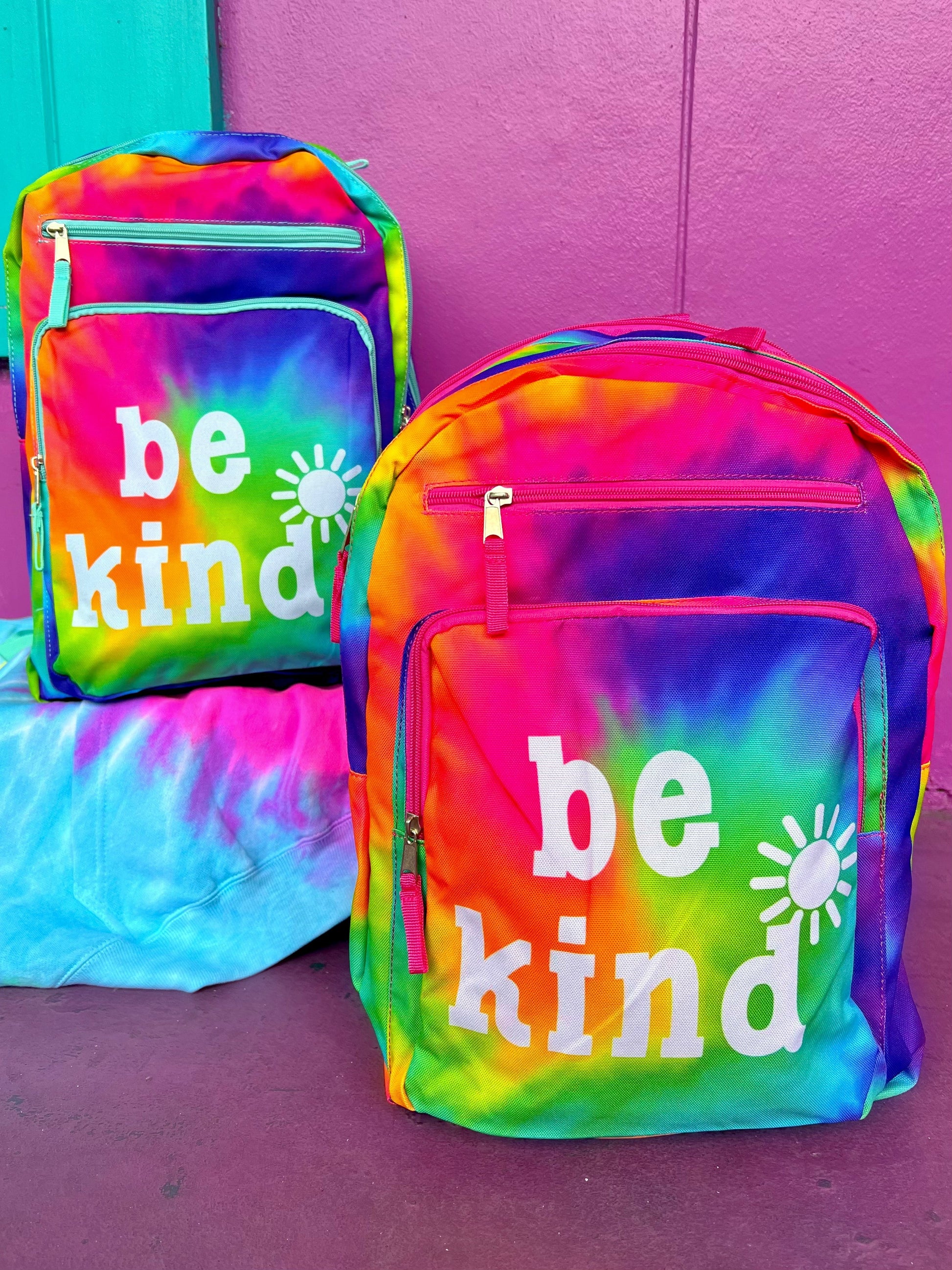Our brand new Be Kind Backpack was designed by Serena just for you! It has multiple zippers and pouches so you can store everything you need! This backpack is bright tie-dye and a nice soft style. Be Kind all year long while carrying this adorable style!