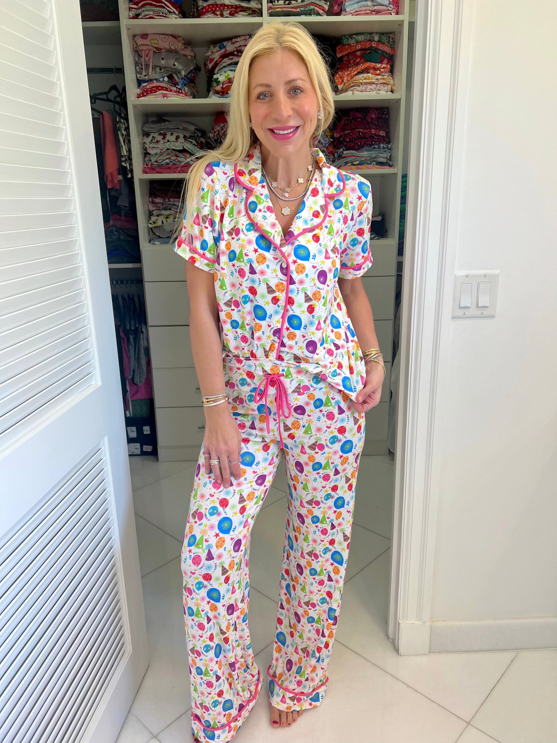 Hey Birthday Girl! These are the jammies for you!! Celebrate in style in our brand new pjs. And, these make the greatest gift to give all of your girlies!! This set fits true to size! Made in our signature buttery soft fabric, this style features our wide leg pants and our short sleeve button top. Once you try our pajamas you won't want to wear anything else!