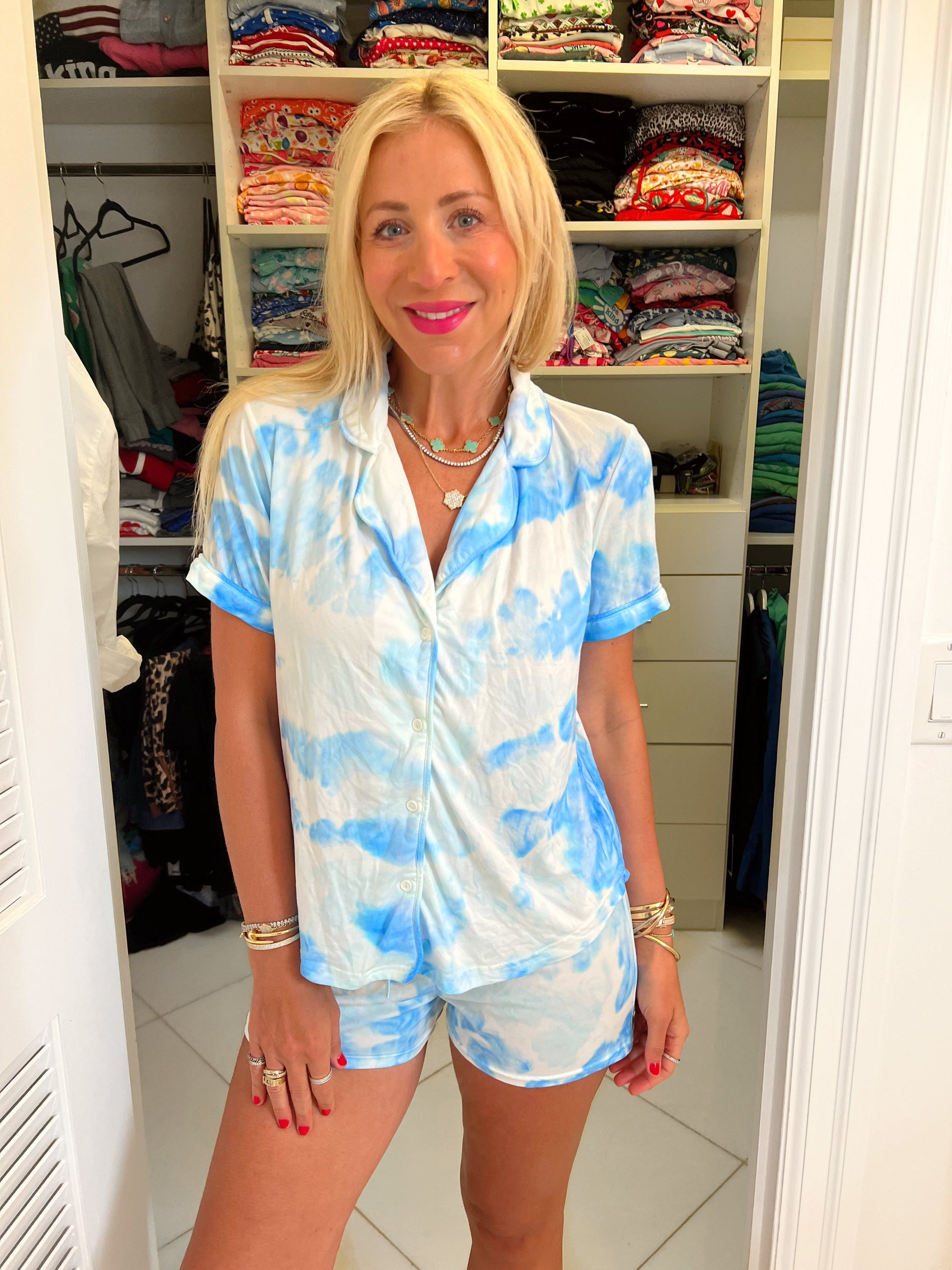 Have the sweetest dreams in our brand new Blue Cloud Pajama Set! We had so many requests for more tie-dye shorts sets we just had to make the cutest one ever! These jammies are made in our signature, soft fabric and hand dyed to perfection! This set features our short sleeve button down top & our adorable shorts. This set is the perfect pair of pjs to wear to feel cute and comfy!
