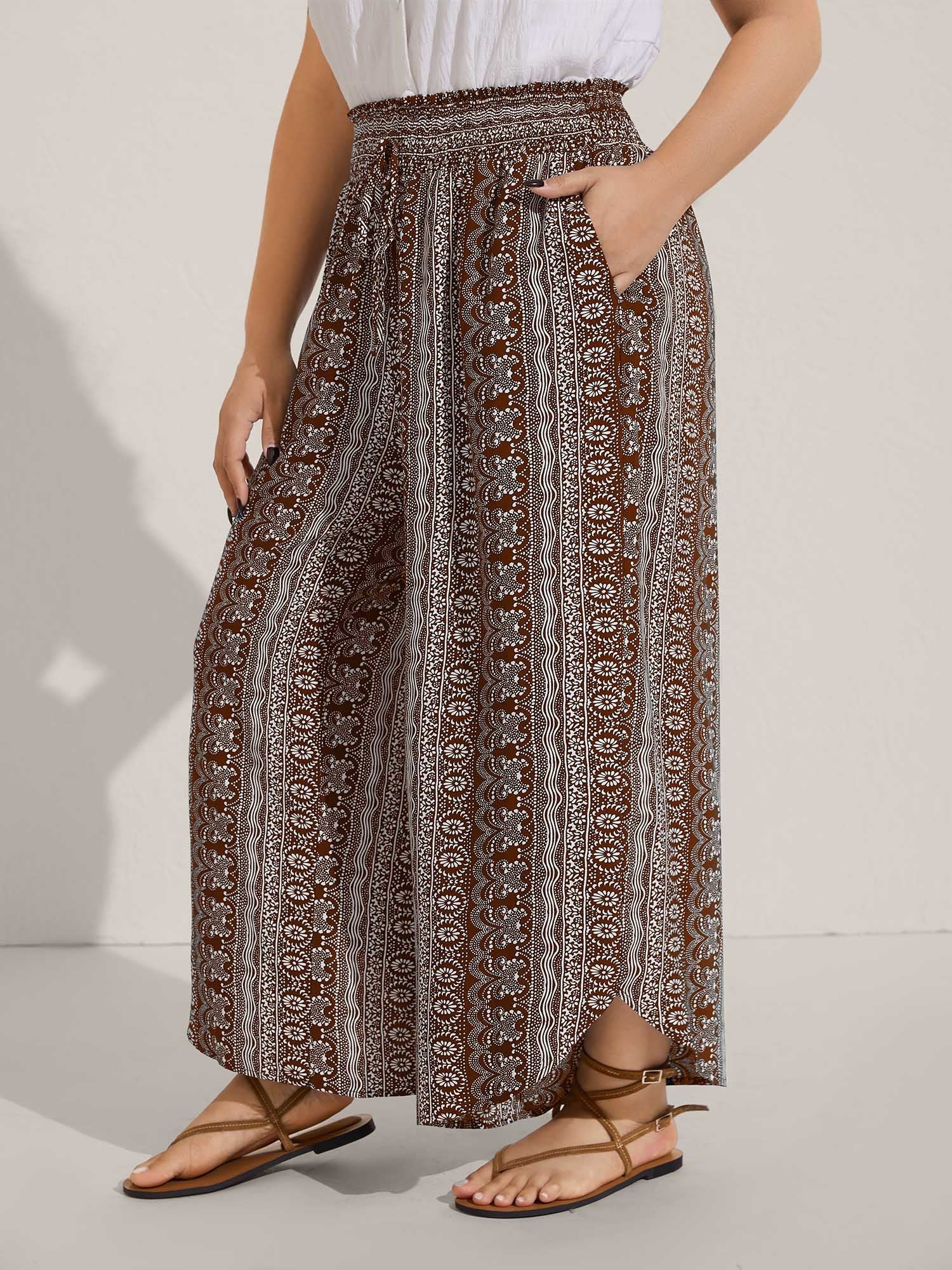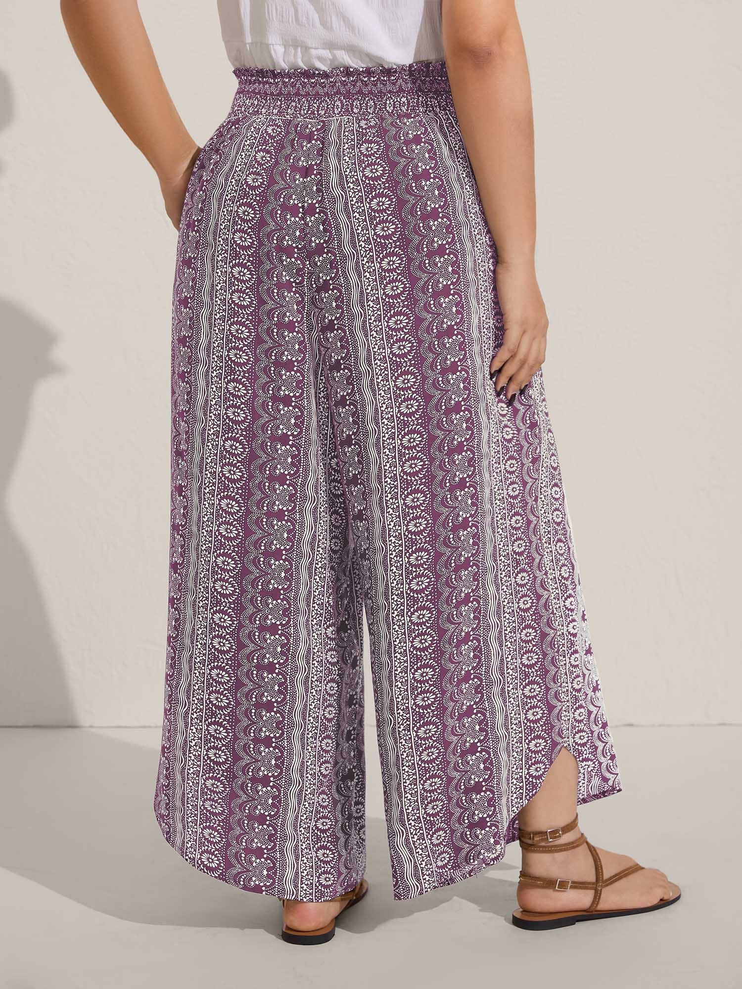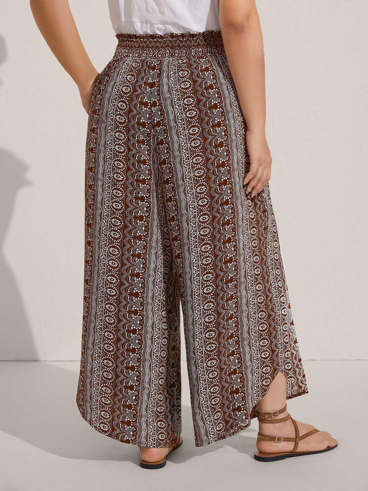 Boho Print Shirred Waist Wide-Leg Pants