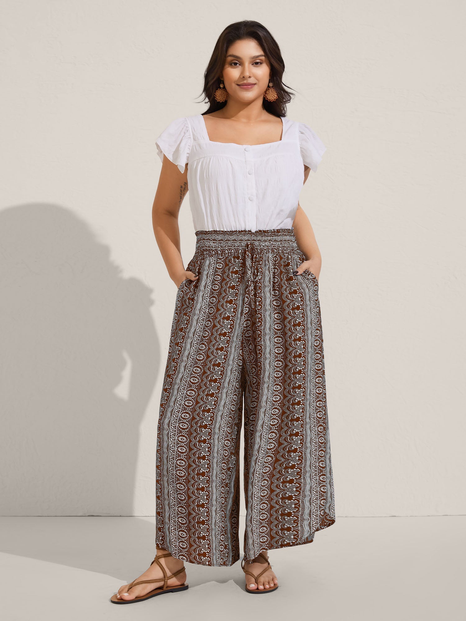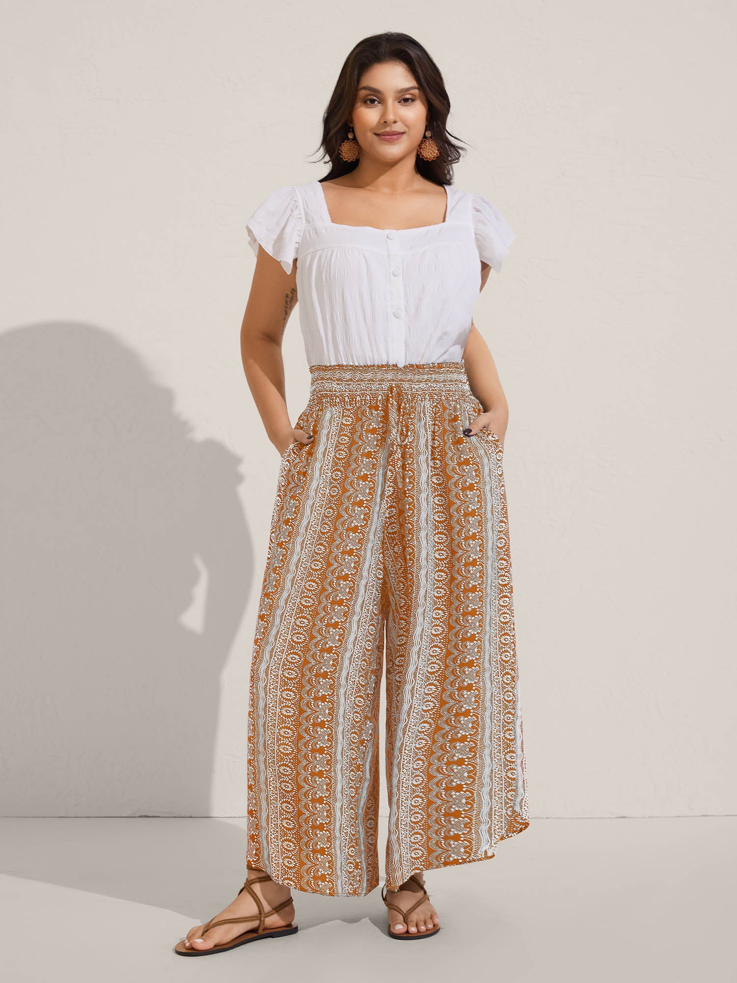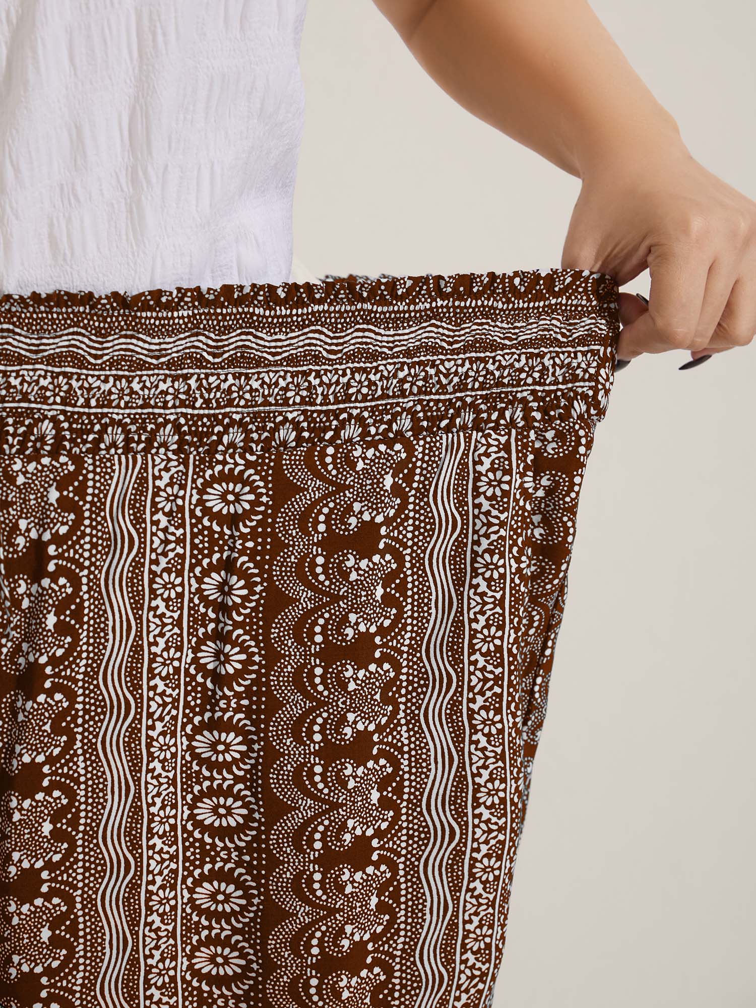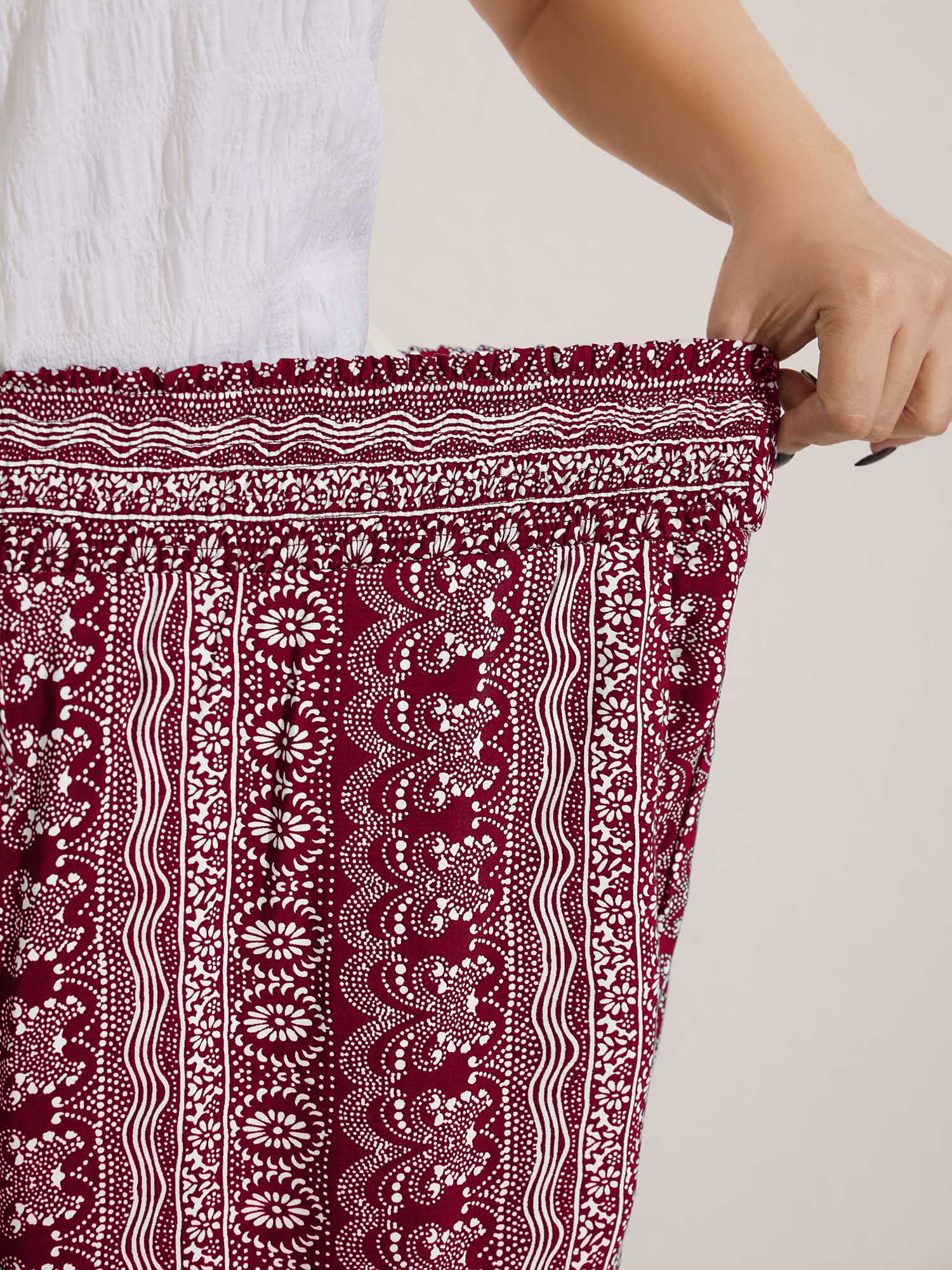 Boho Print Shirred Waist Wide-Leg Pants