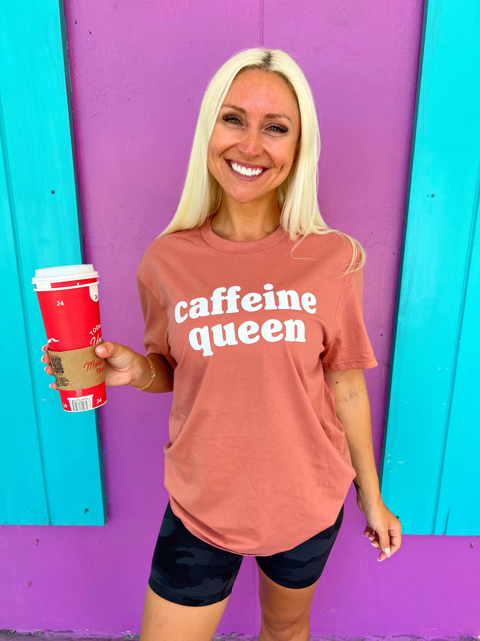 • Gorgeous latte-colored tee with bold white 'Caffeine Queen' lettering.