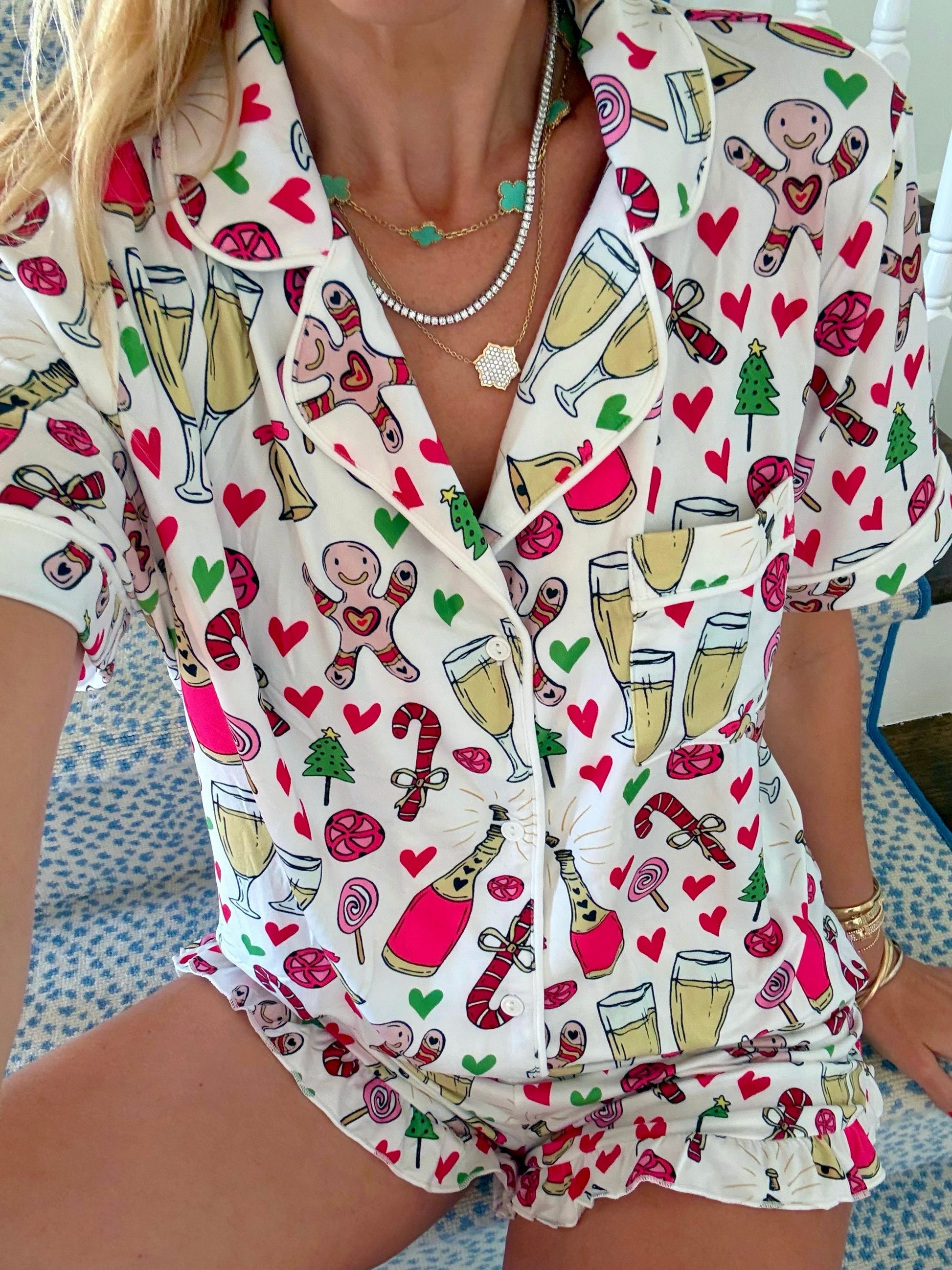 Welcome the holidays in style with the Champagne Cheers Ruffle Pajama Shorts Set from Sunshine Sisters! This charming pajama set features a playful multi-colored holiday print against a white background, complete with white piping and a fuchsia satin bow for a fun and elegant touch. The set includes a short-sleeve button-down top and matching ruffle-trim shorts, crafted from our signature ultra-soft, extra stretchy pajama fabric for a snug yet breathable fit. Whether you’re busy in the kitchen making cookies or enjoying a cozy night in, these festive PJs are perfect for celebrating the season in comfort and style. Available in adult sizes XS to 3XL, these jammies fit true to size and offer the perfect blend of cozy and chic for your holiday pajama collection!