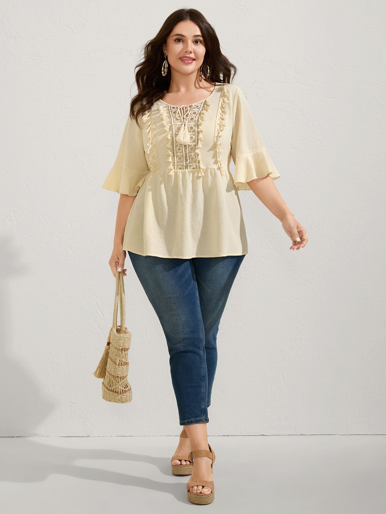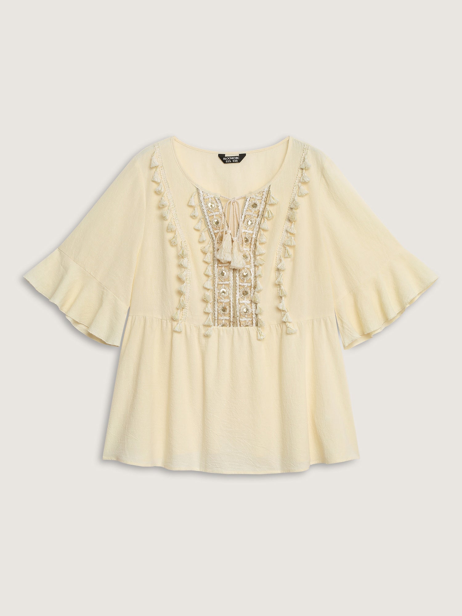 Cotton Tassel Neckline Ruffled Sleeve Solid Top