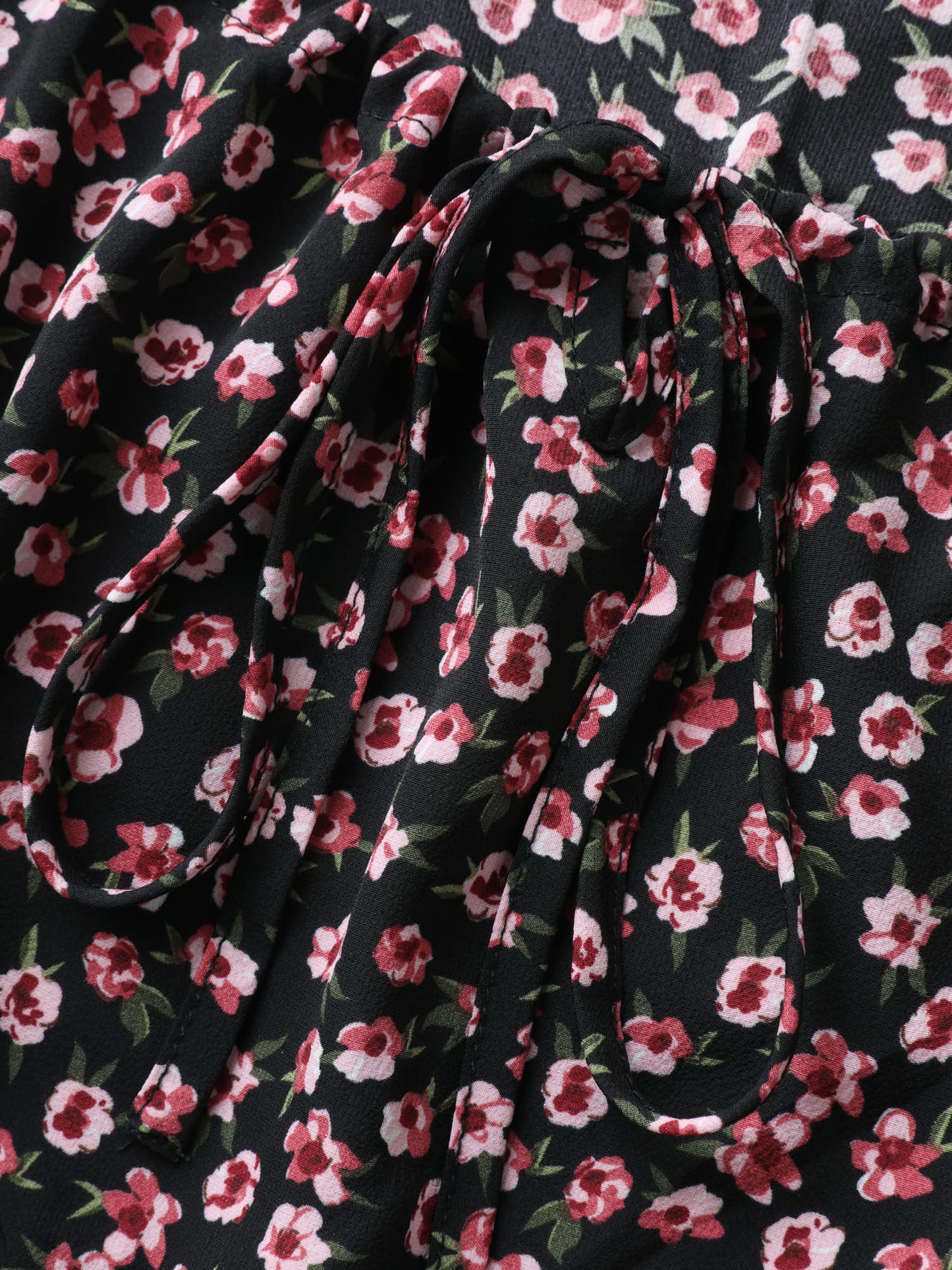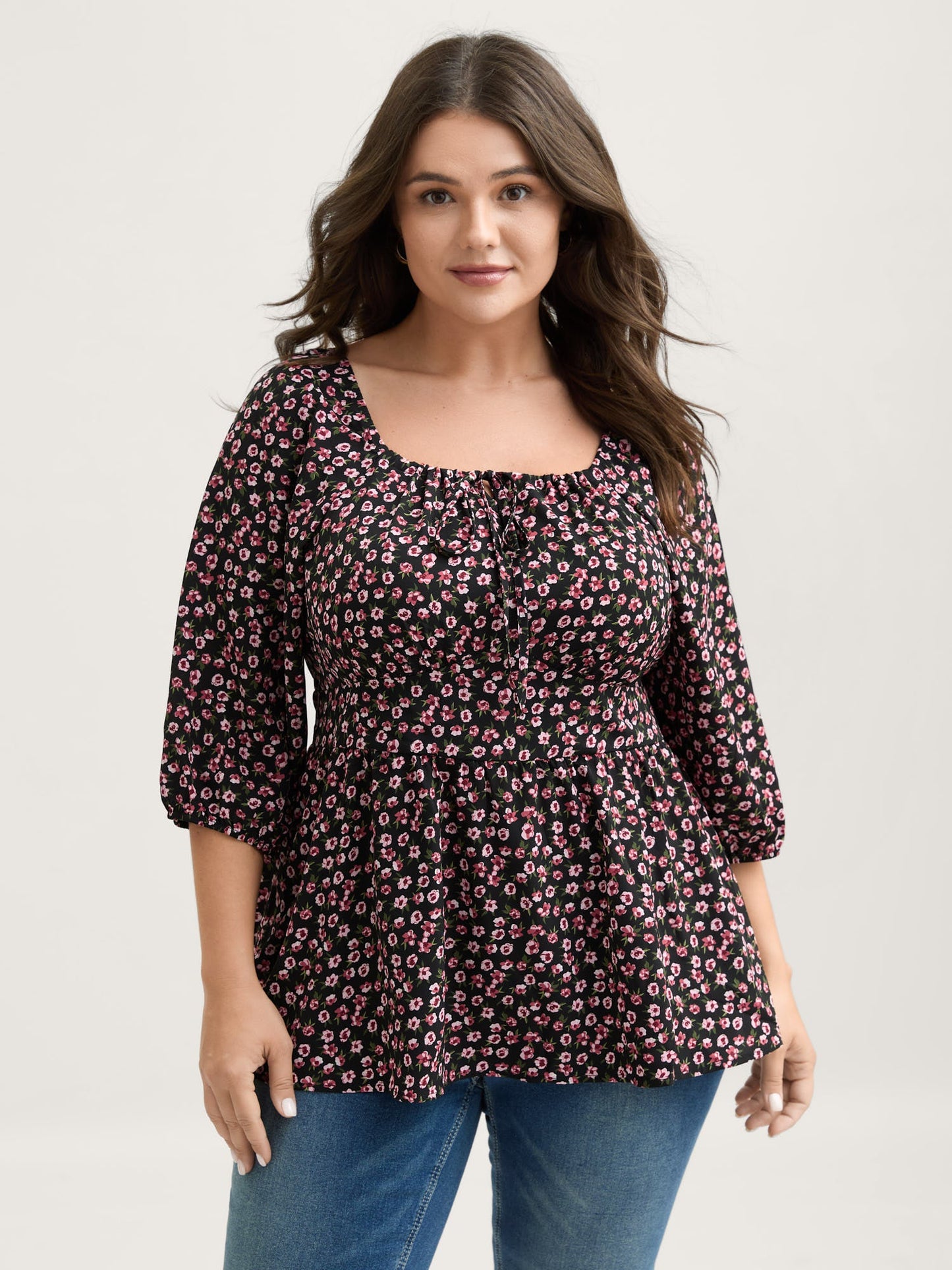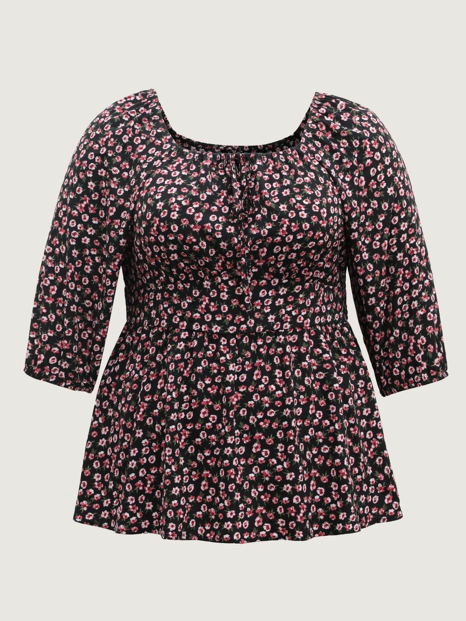 Floral Adjustable Drawstring Neck Shirred Blouse