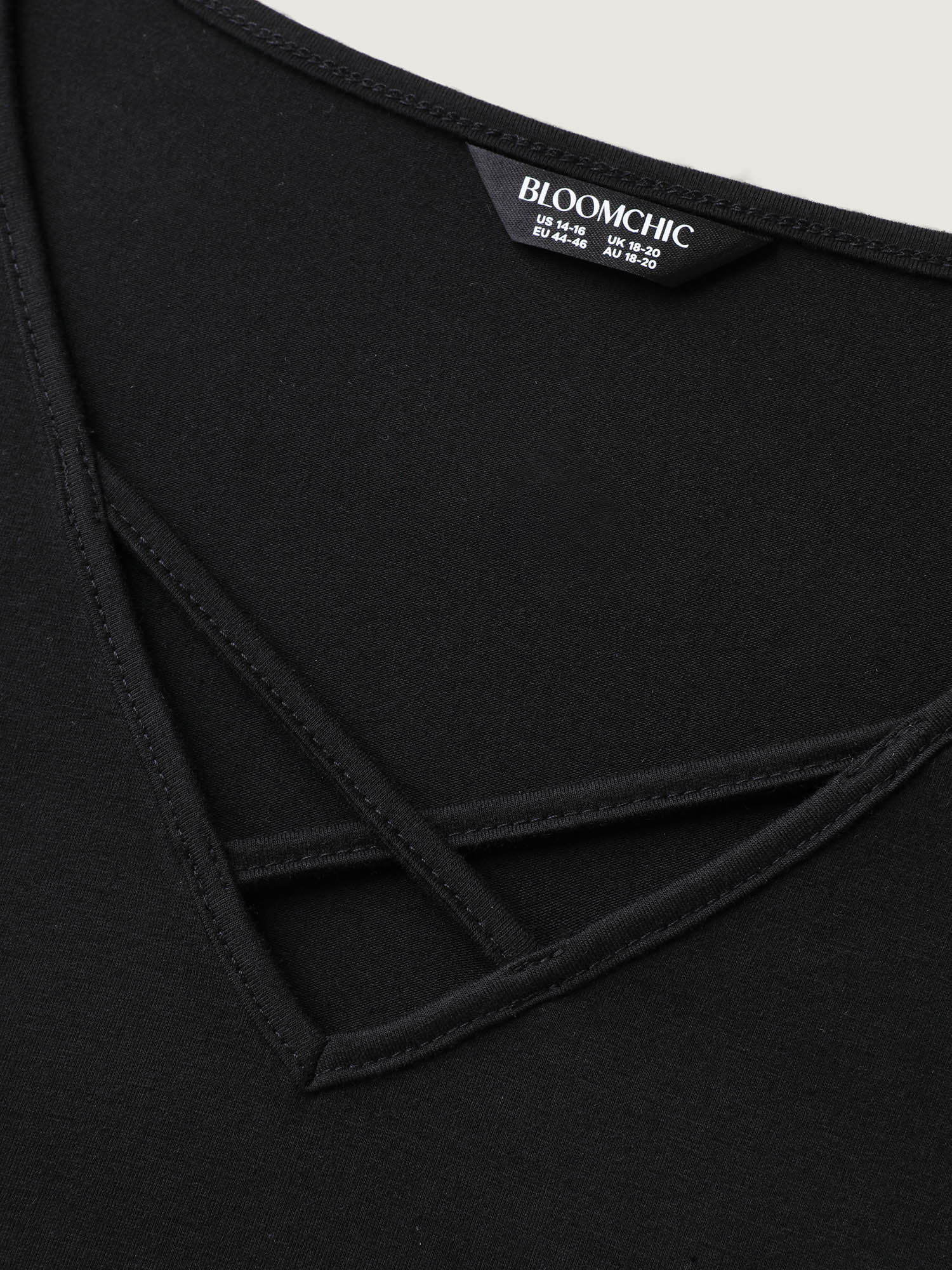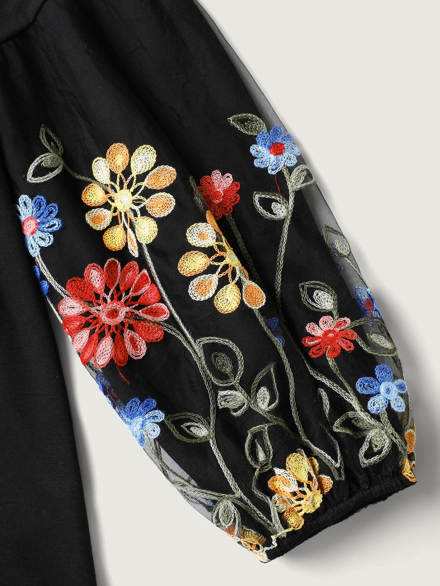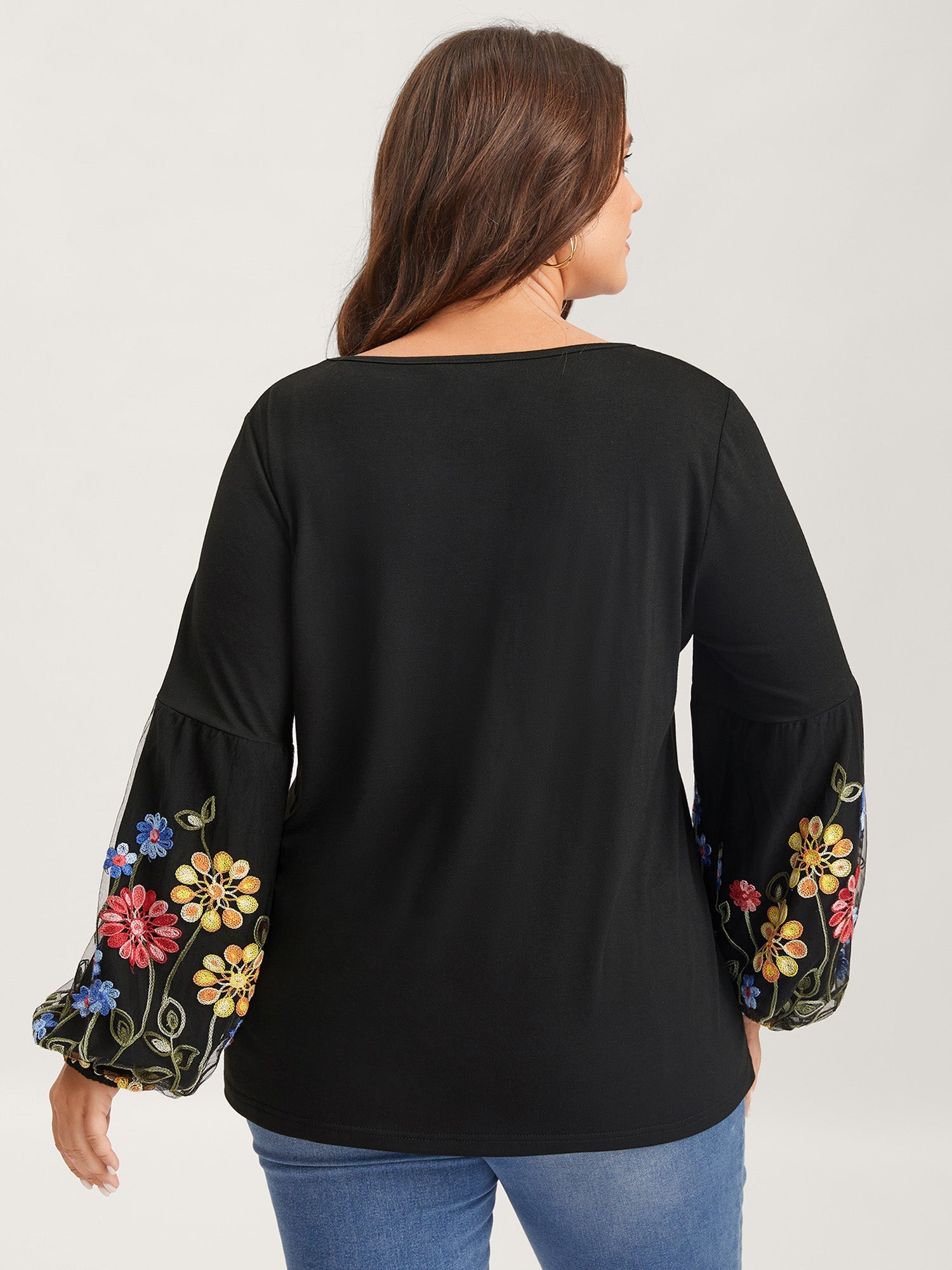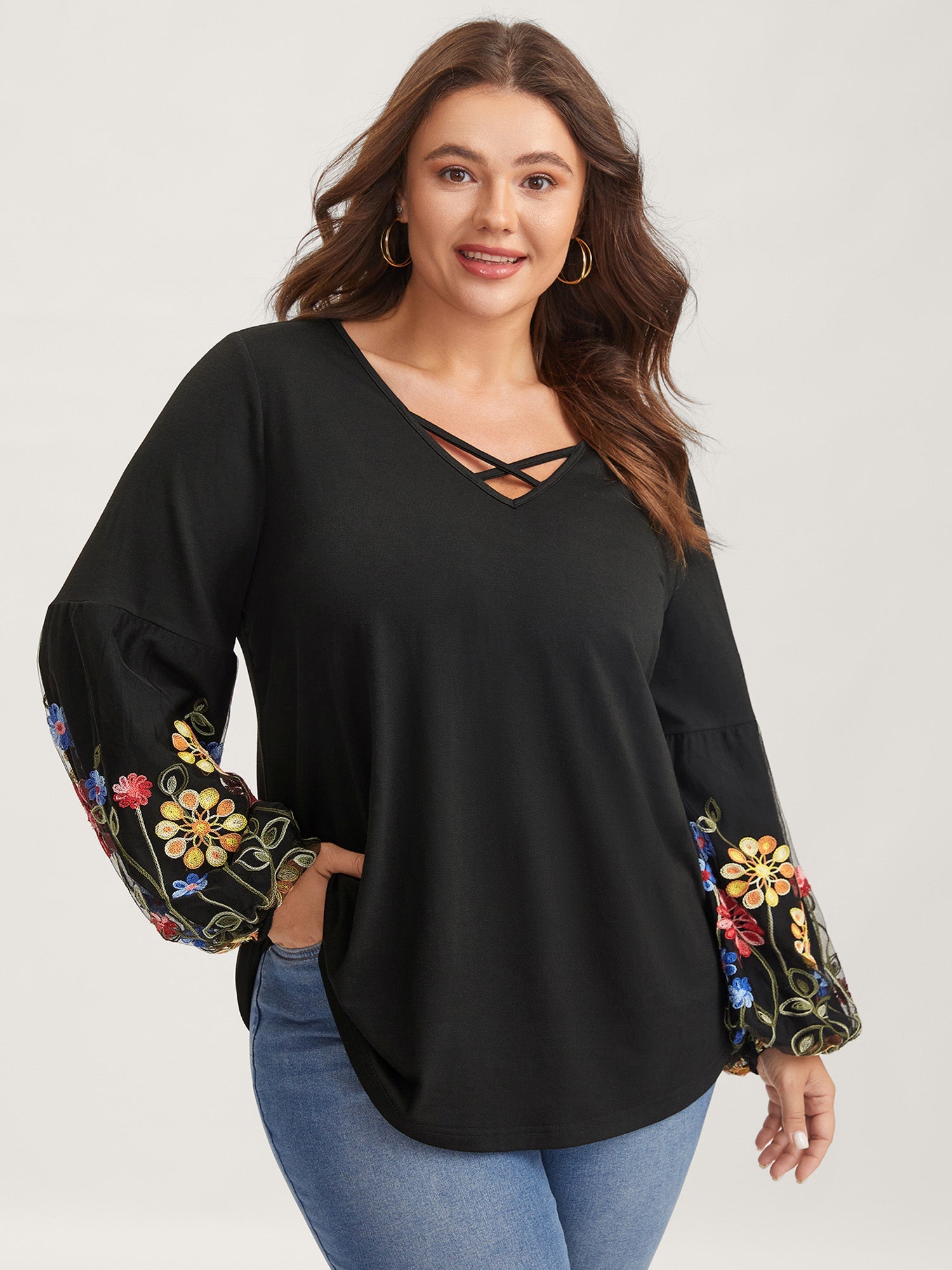 Floral Embroidered Sleeve Neck Tie-Up T-Shirt
