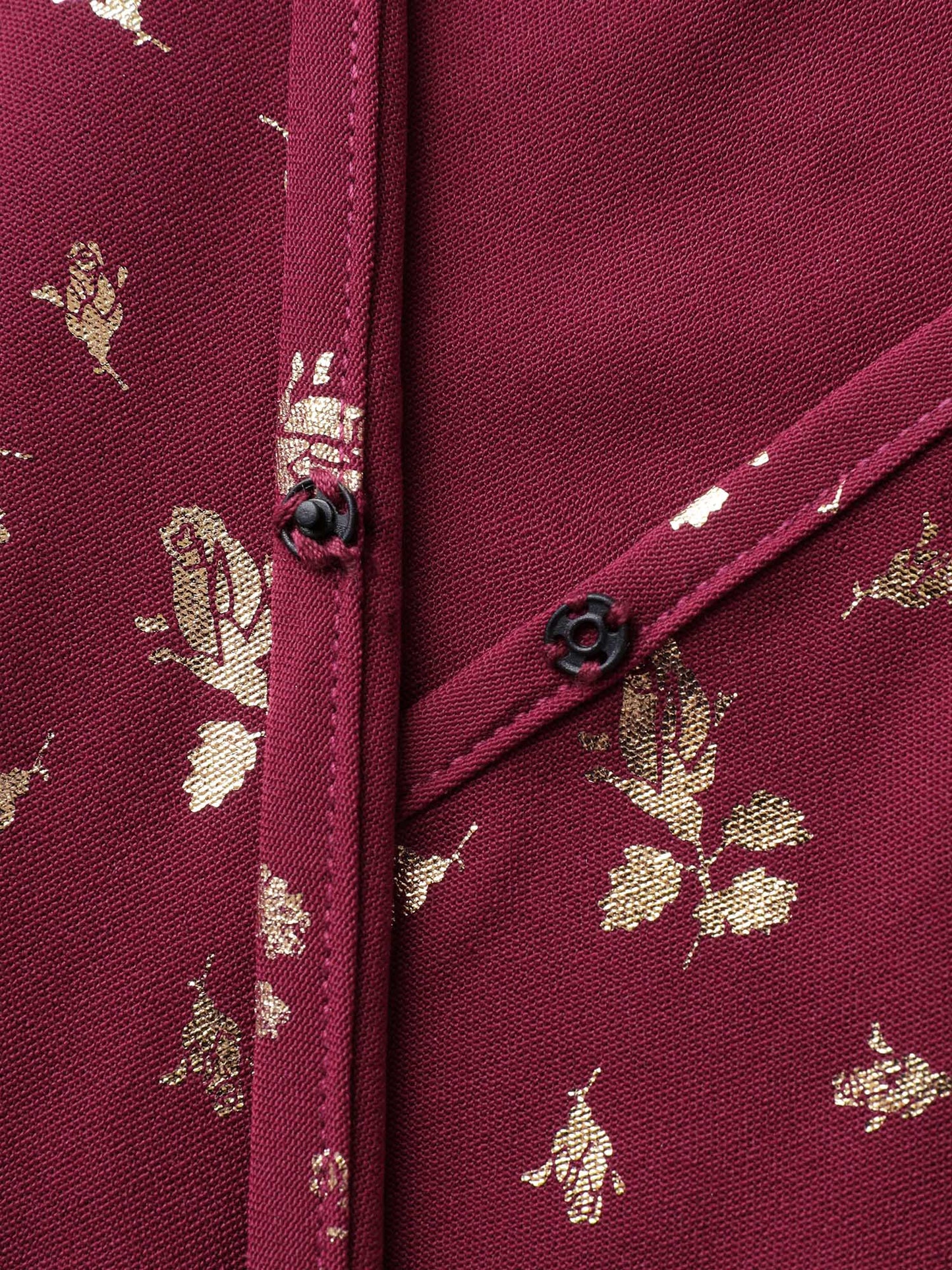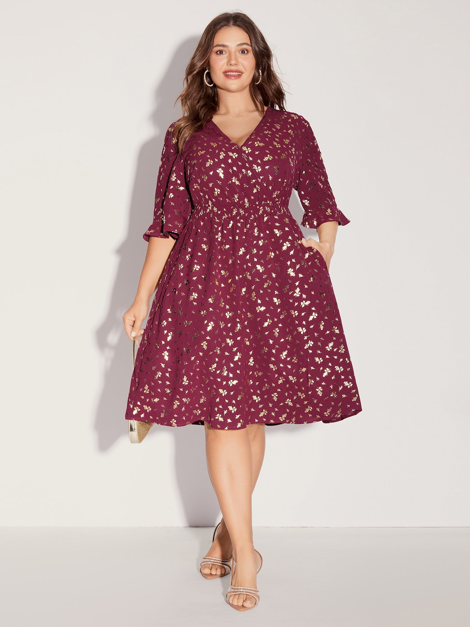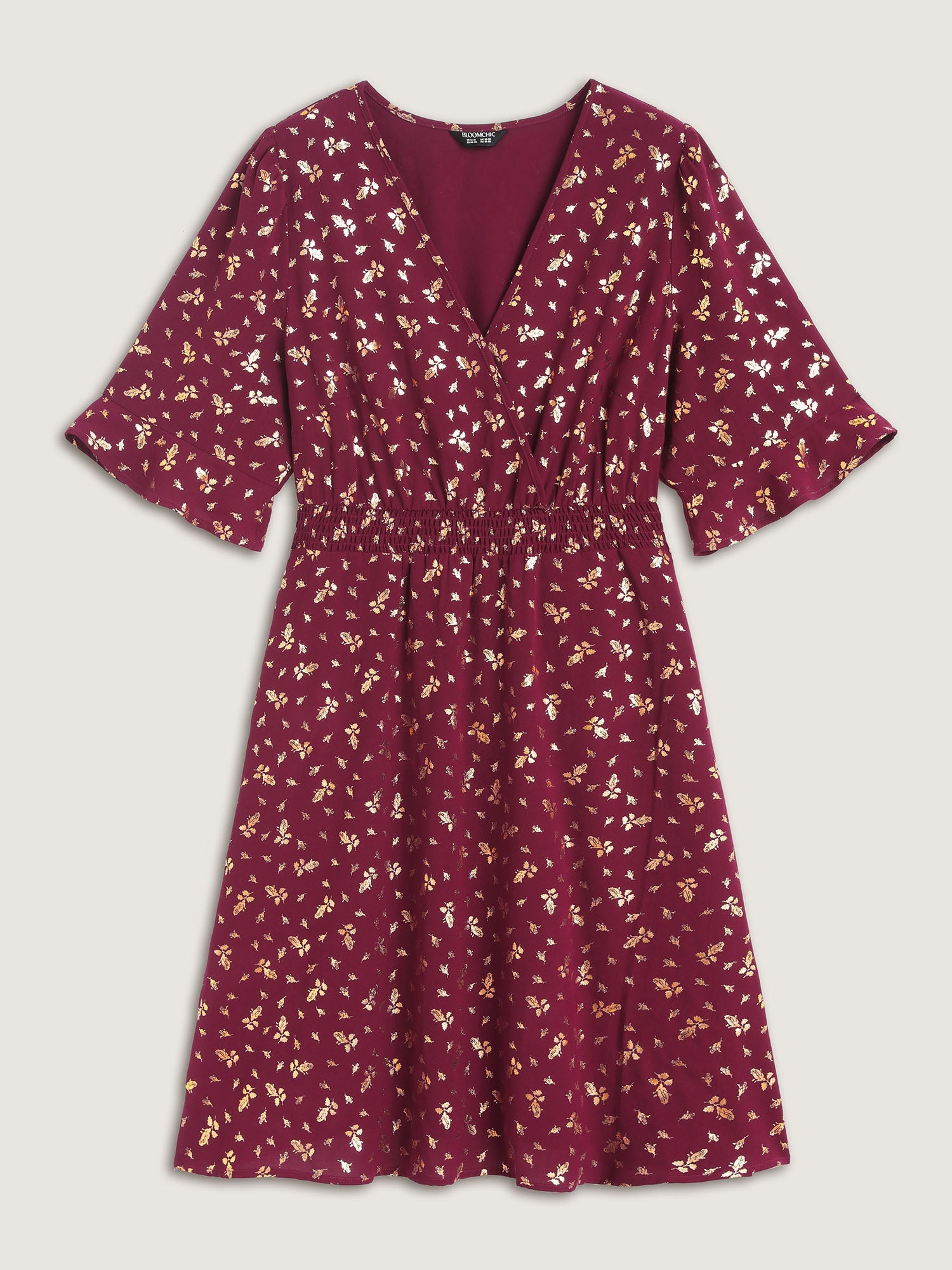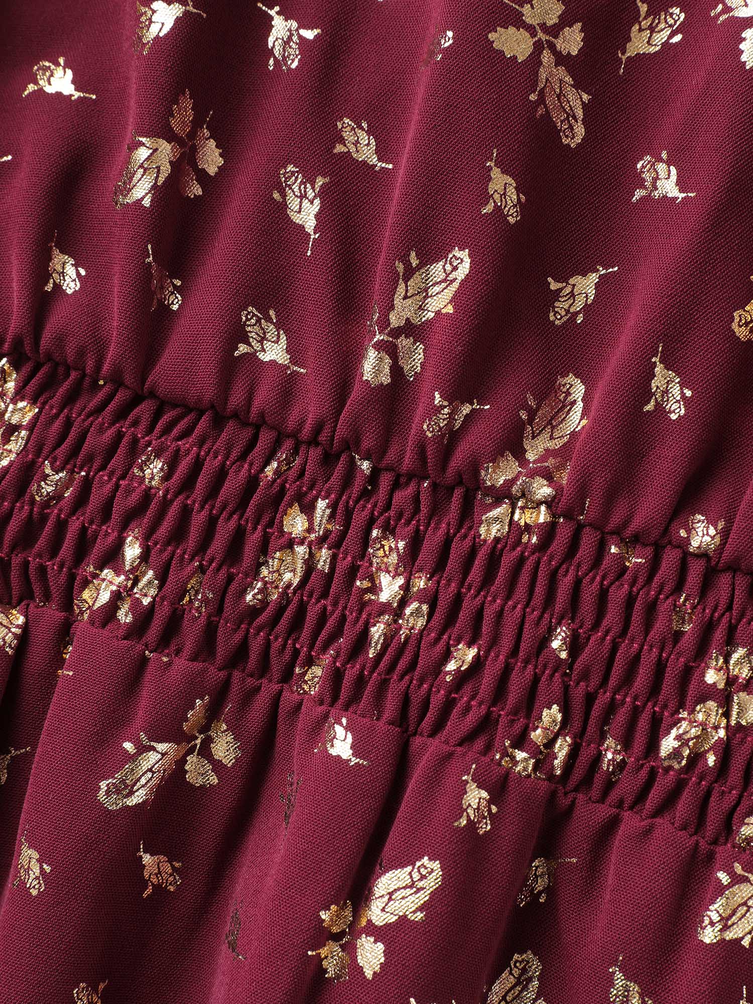 Gold-Foil Shimmery Shirred-Waist Midi Dress