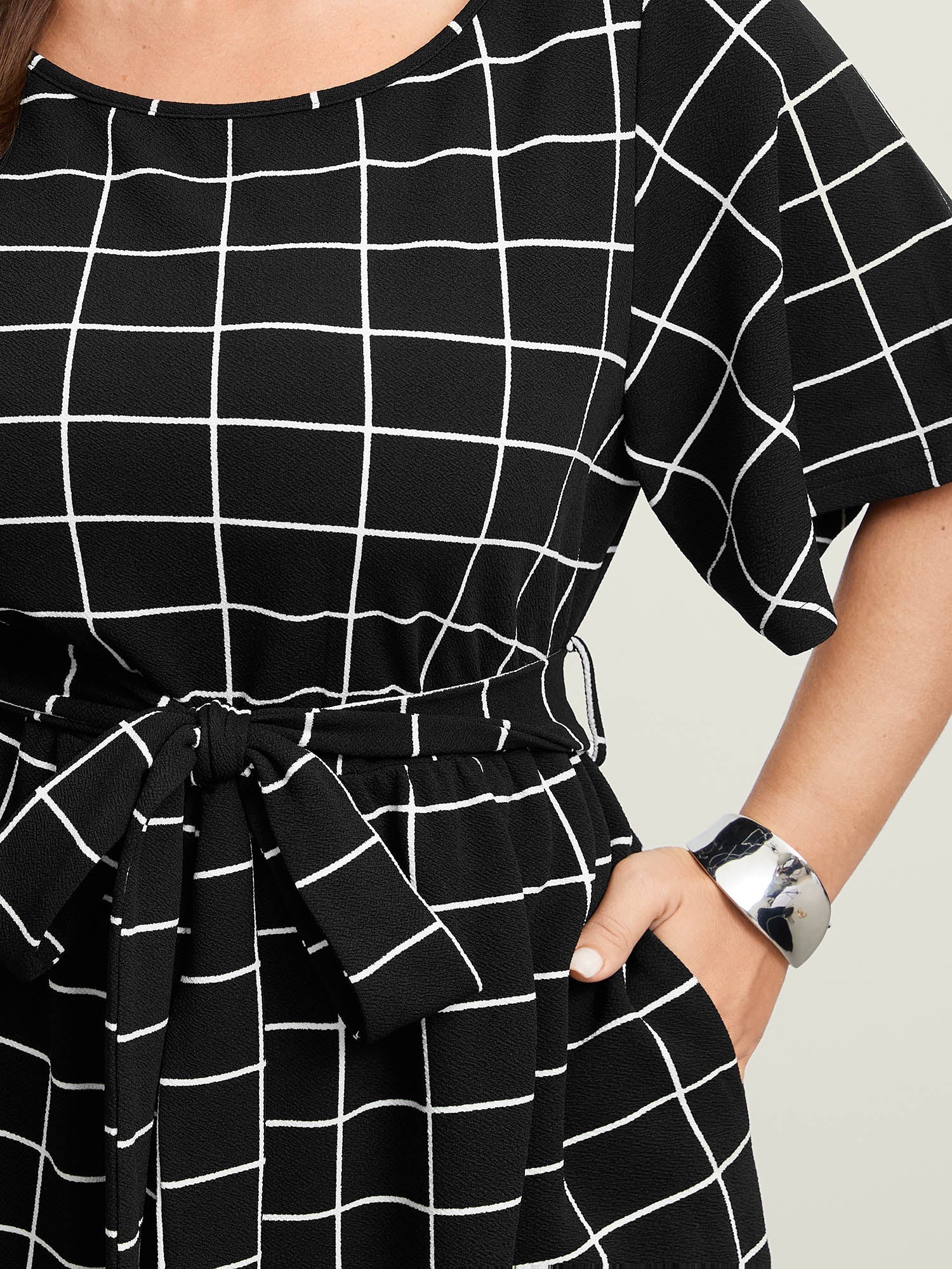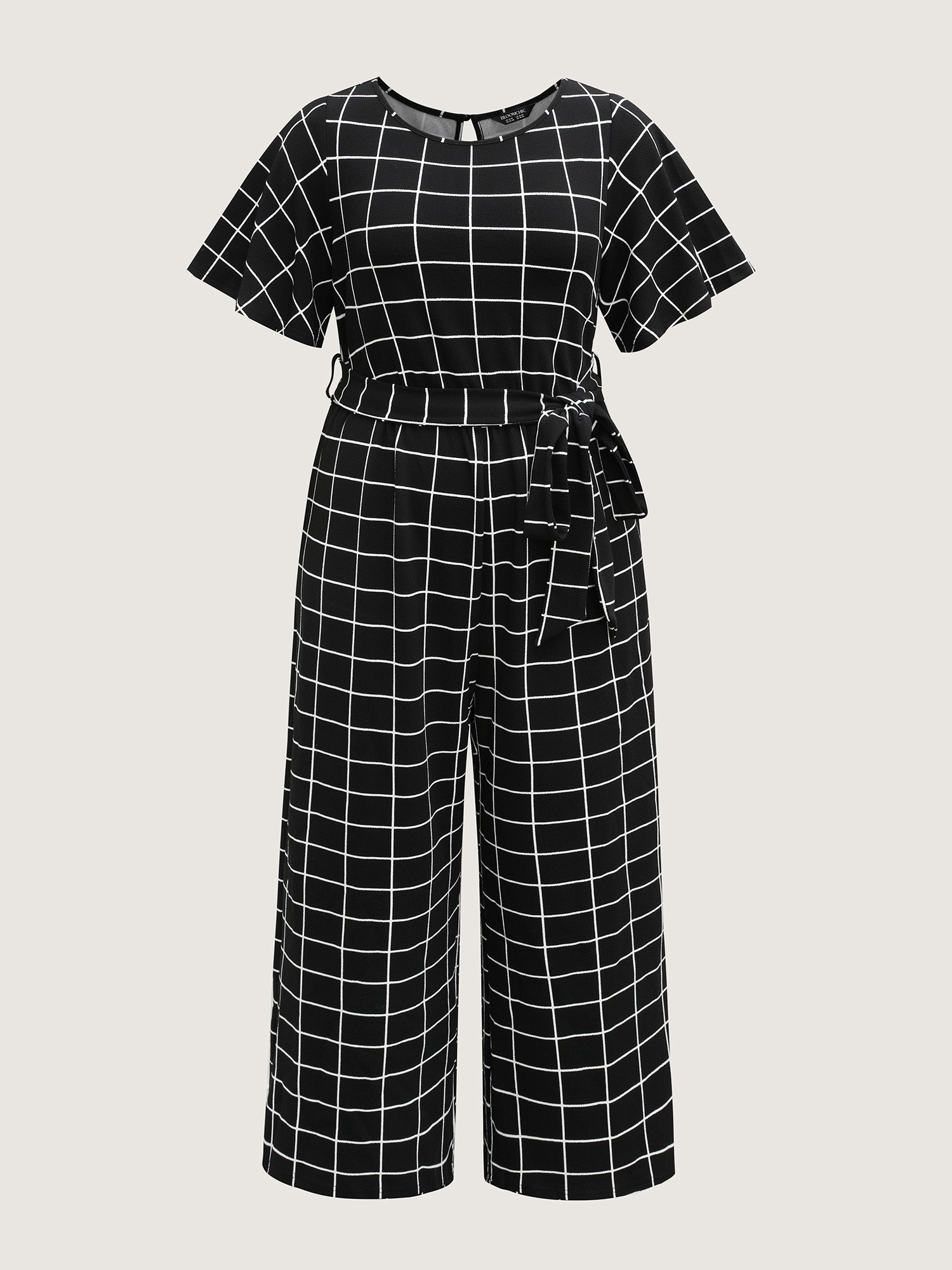 Grid Print Cinched Belted Waist Jumpsuit