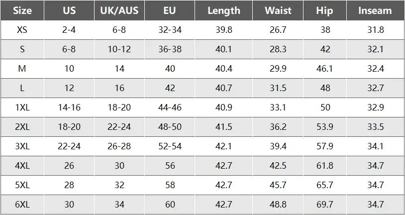 Size | US | UK/AUS | EU | Length | Waist | Hip |