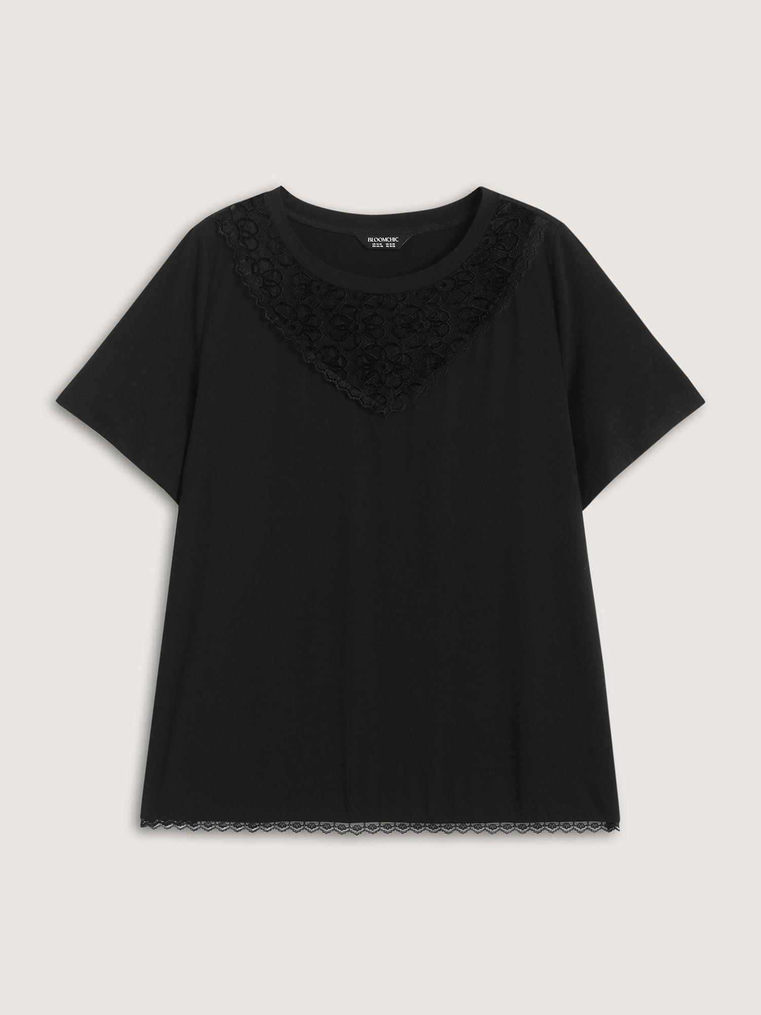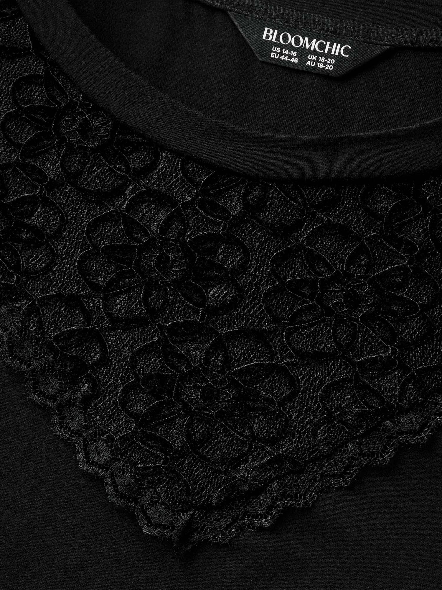 Lace Neck Flowy Sleeve Solid T-Shirt