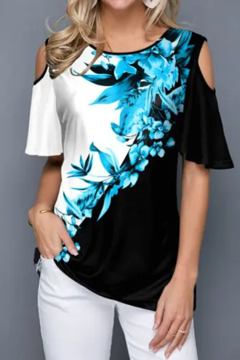 Leaf Flower Print T Shirt Cold Shoulder Short Sleeve Summer Casual Tee