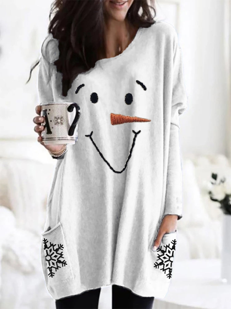 Lovely Snowman Face & Snowflakes Embroidery Cozy Tunic
