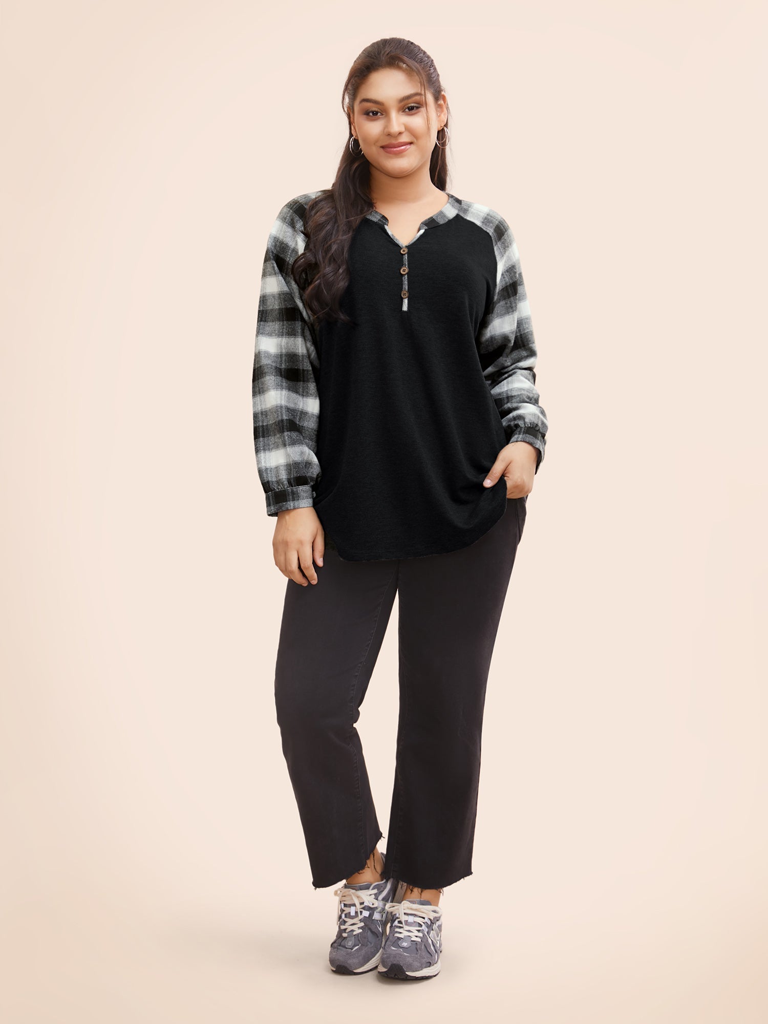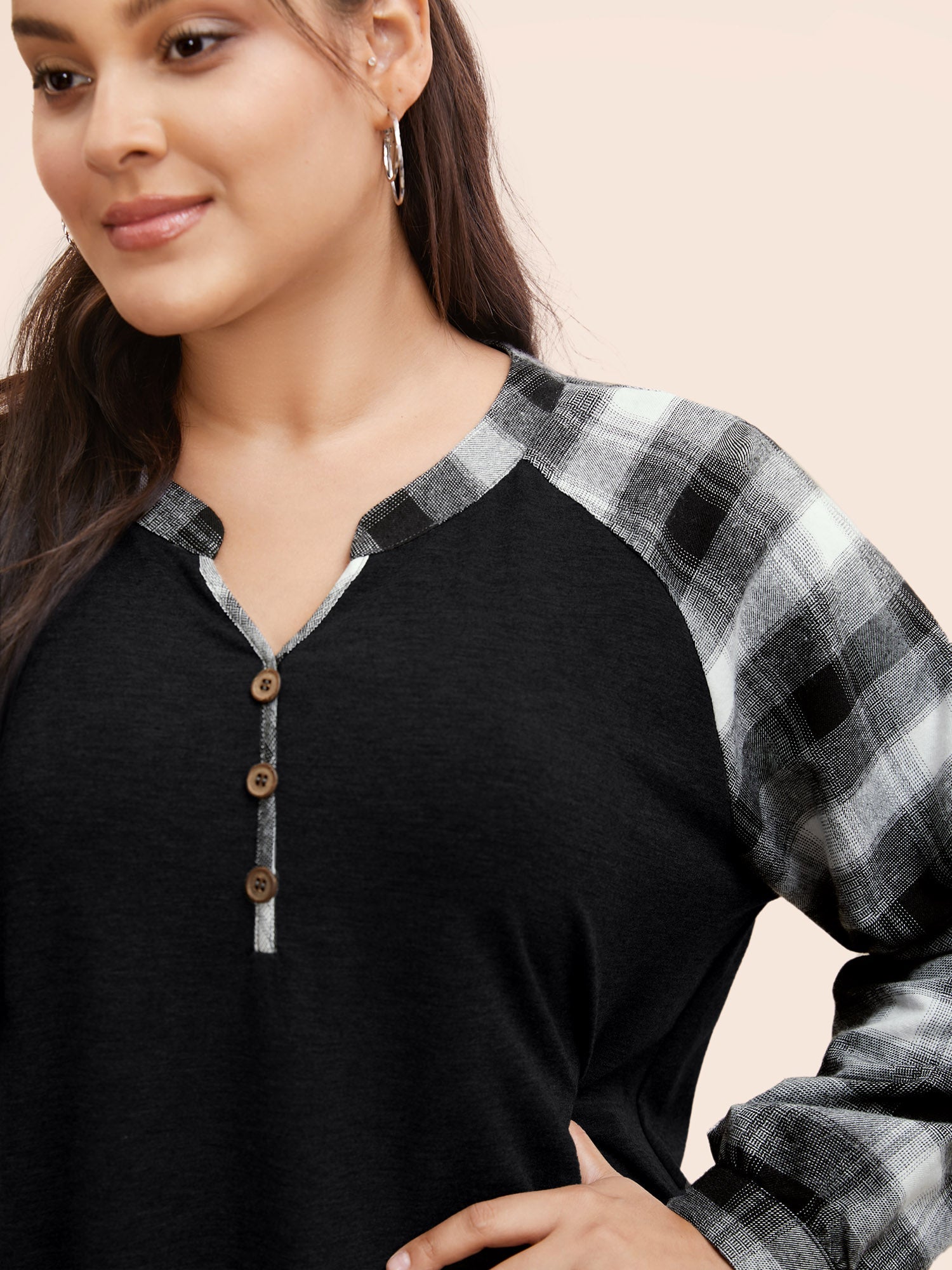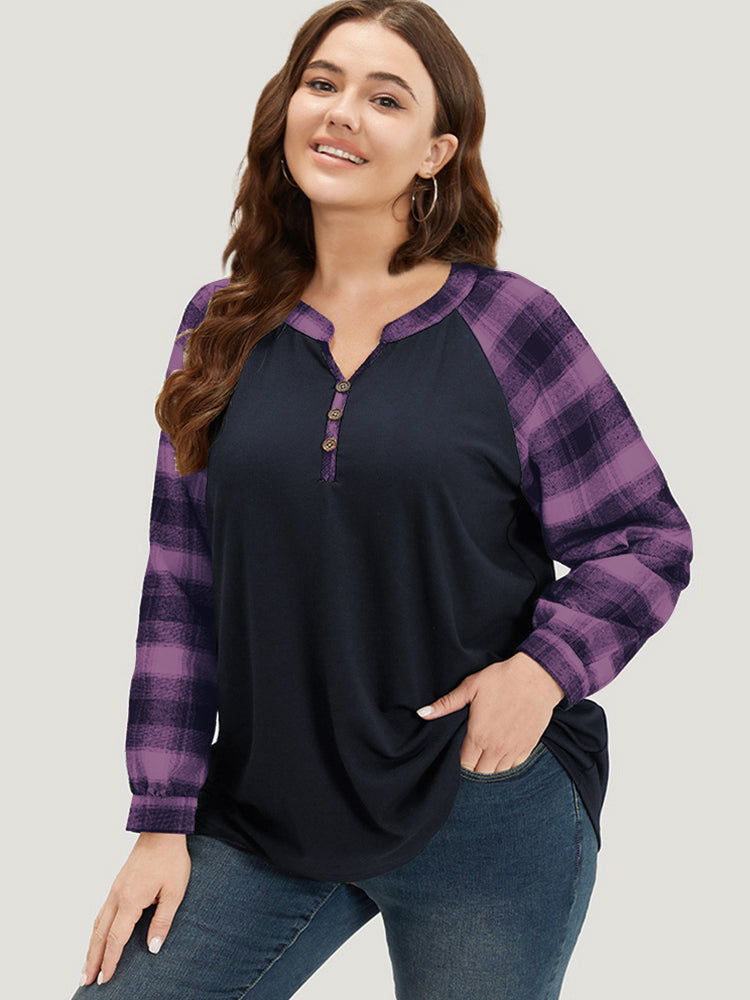 Plaid Patchwork Notched Button Detail Sweatshirt