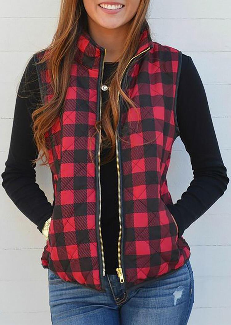 Plaid Pocket Sleeveless Vest Coat without Necklace