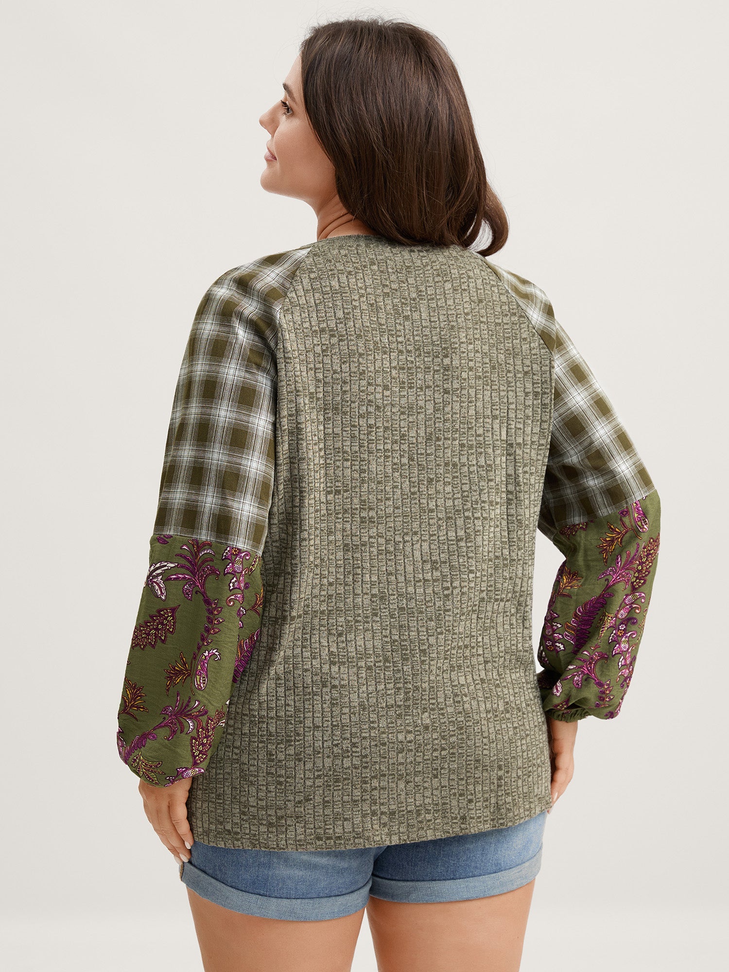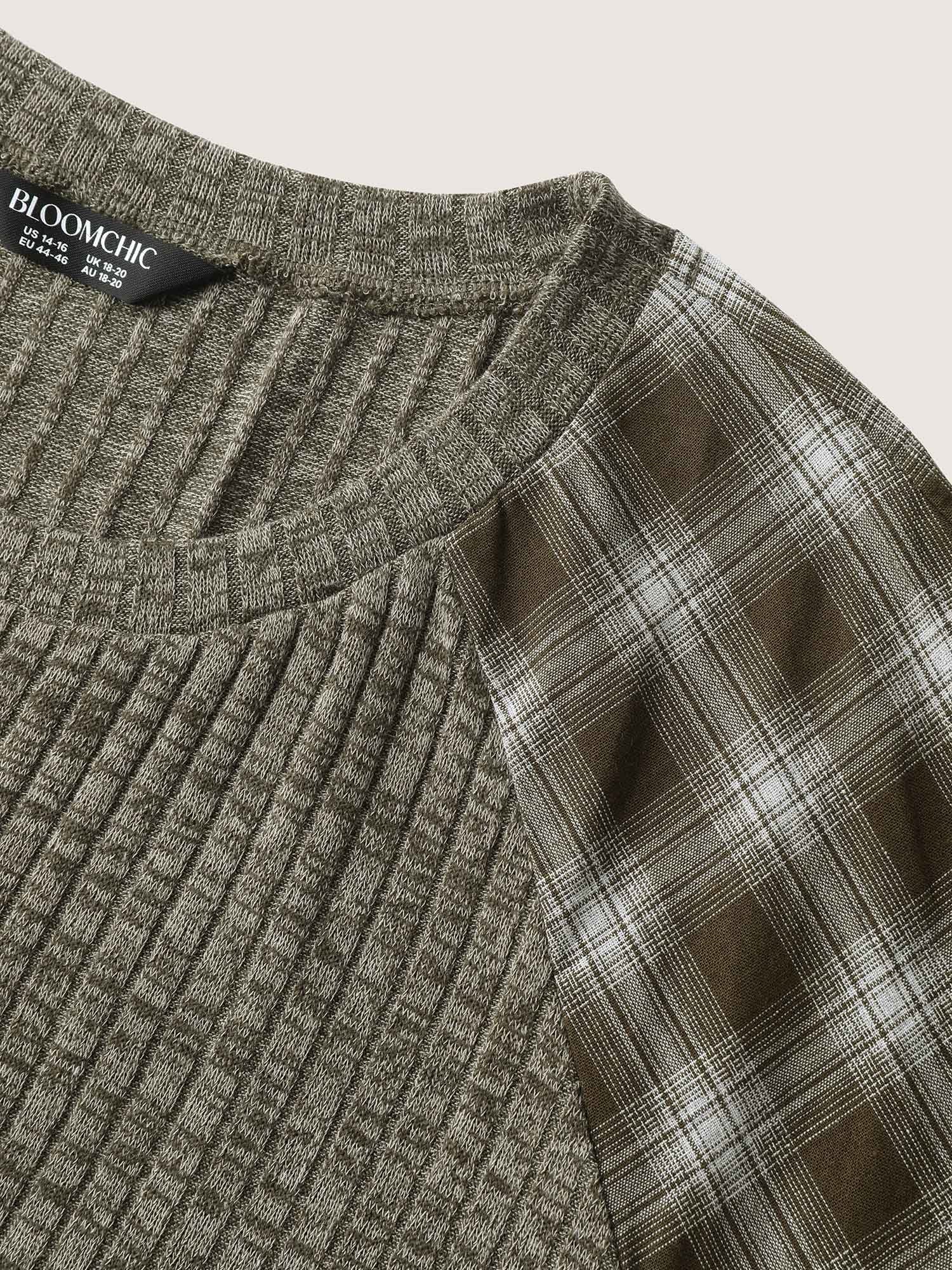 Plaid Sleeve Color Contrast Textured Sweatshirt