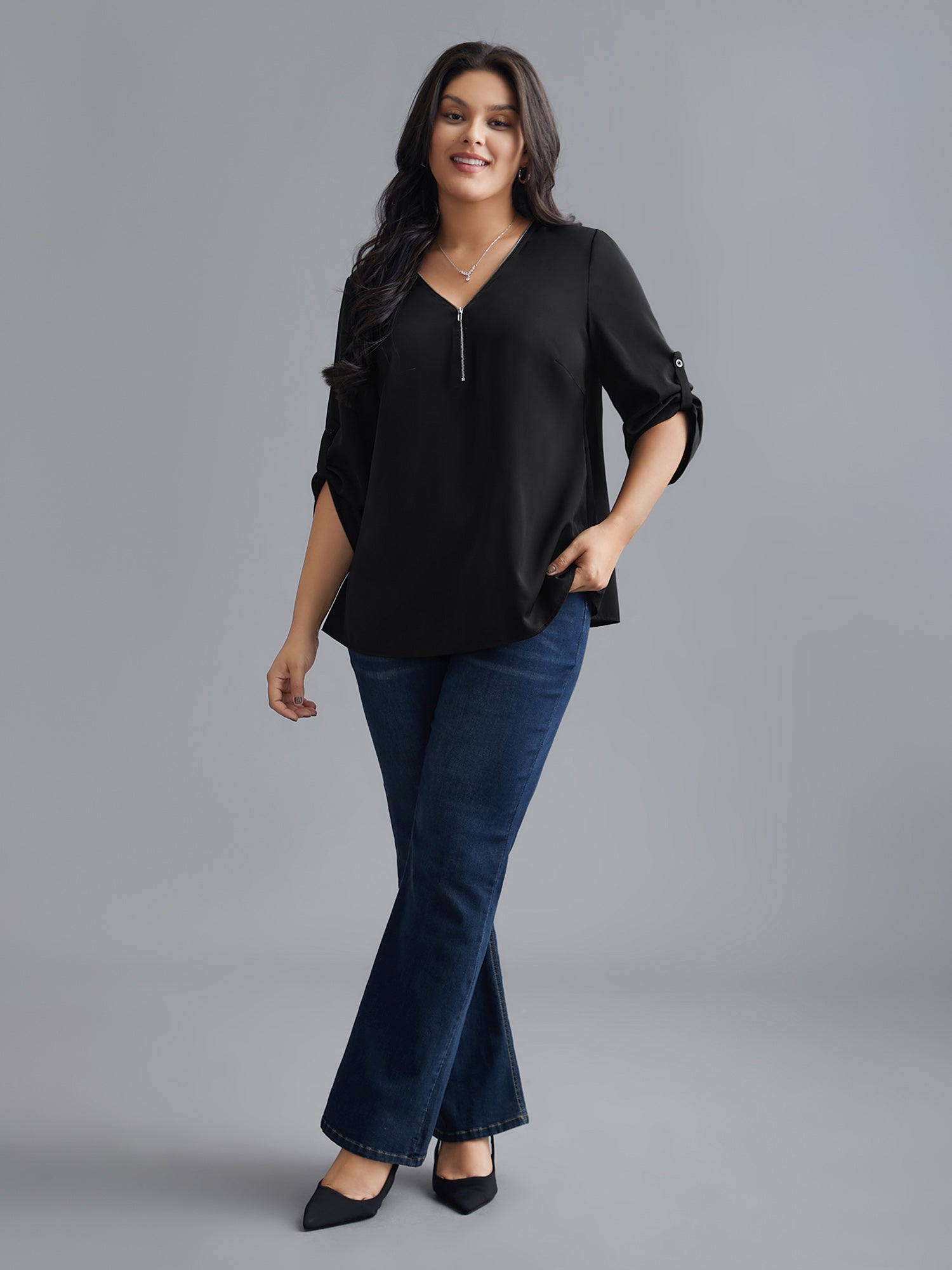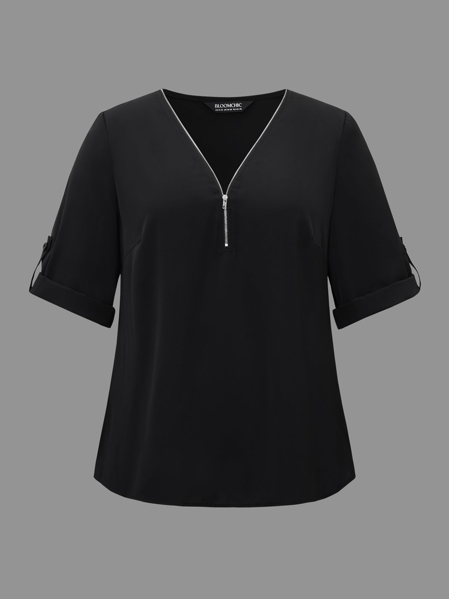 Plain V Neck Half Zip Tab Sleeve Blouse