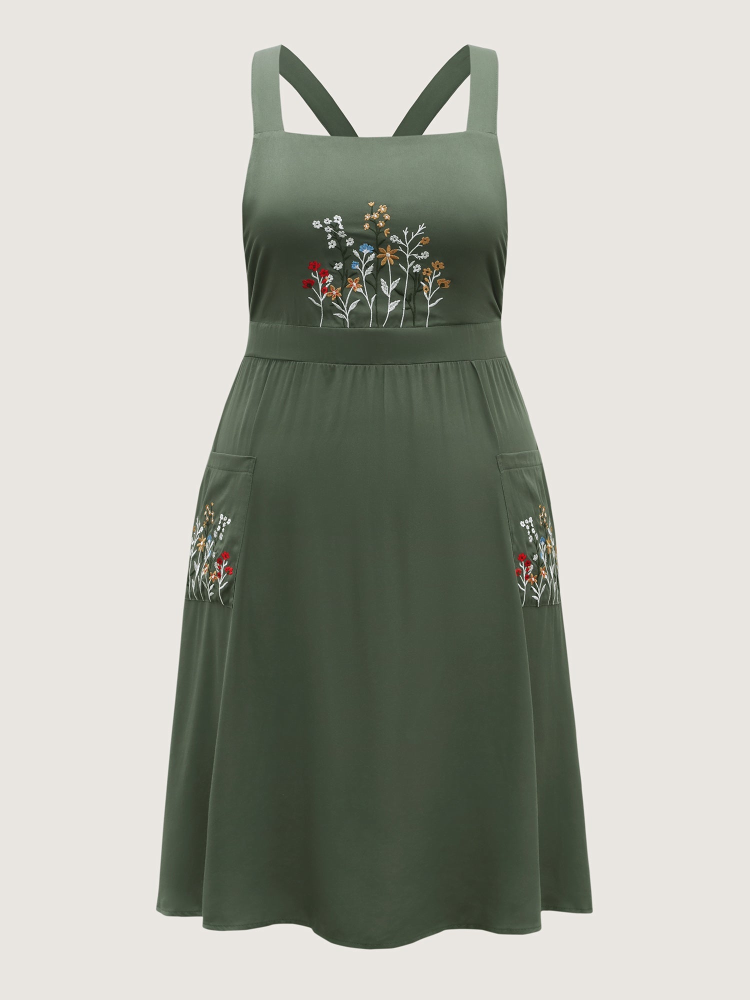 Rayon Floral Embroidery Stretchy Waist Midi Dress
