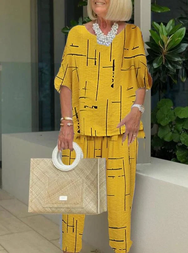 Round Neck 5 / 4 Sleeve Top Slacks 2-piece Set