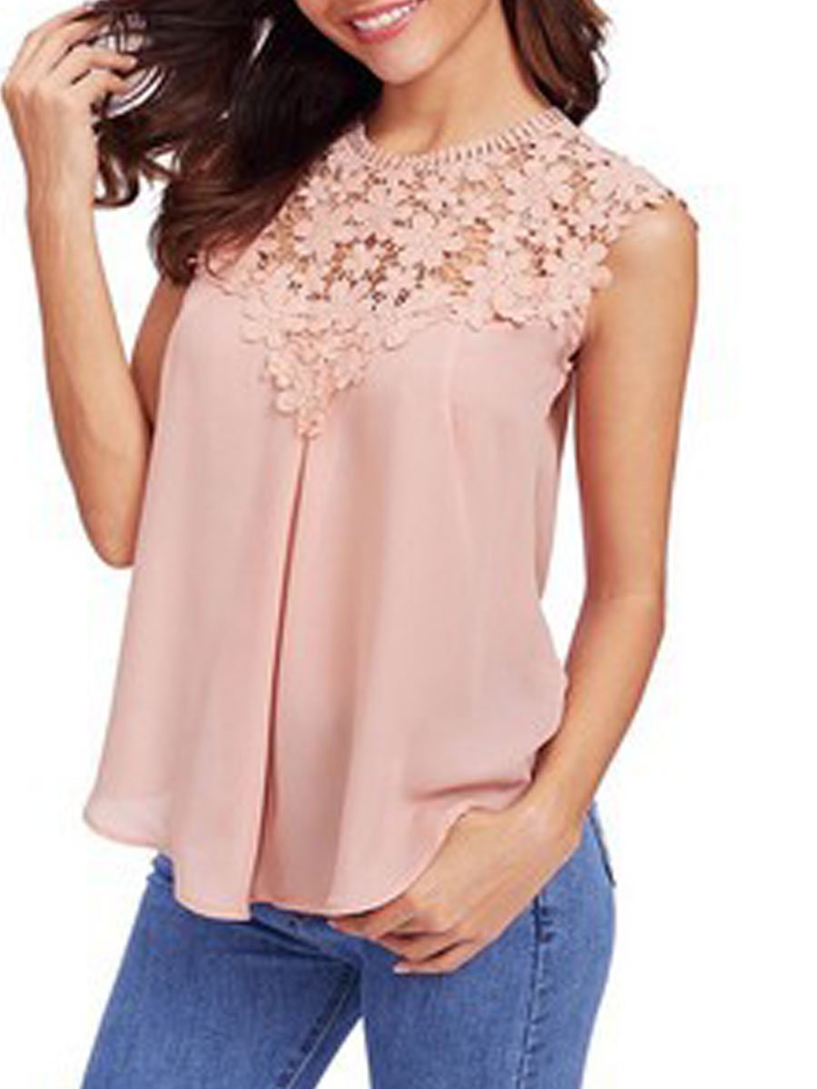 Round Neck Decorative Lace See-Through Tops