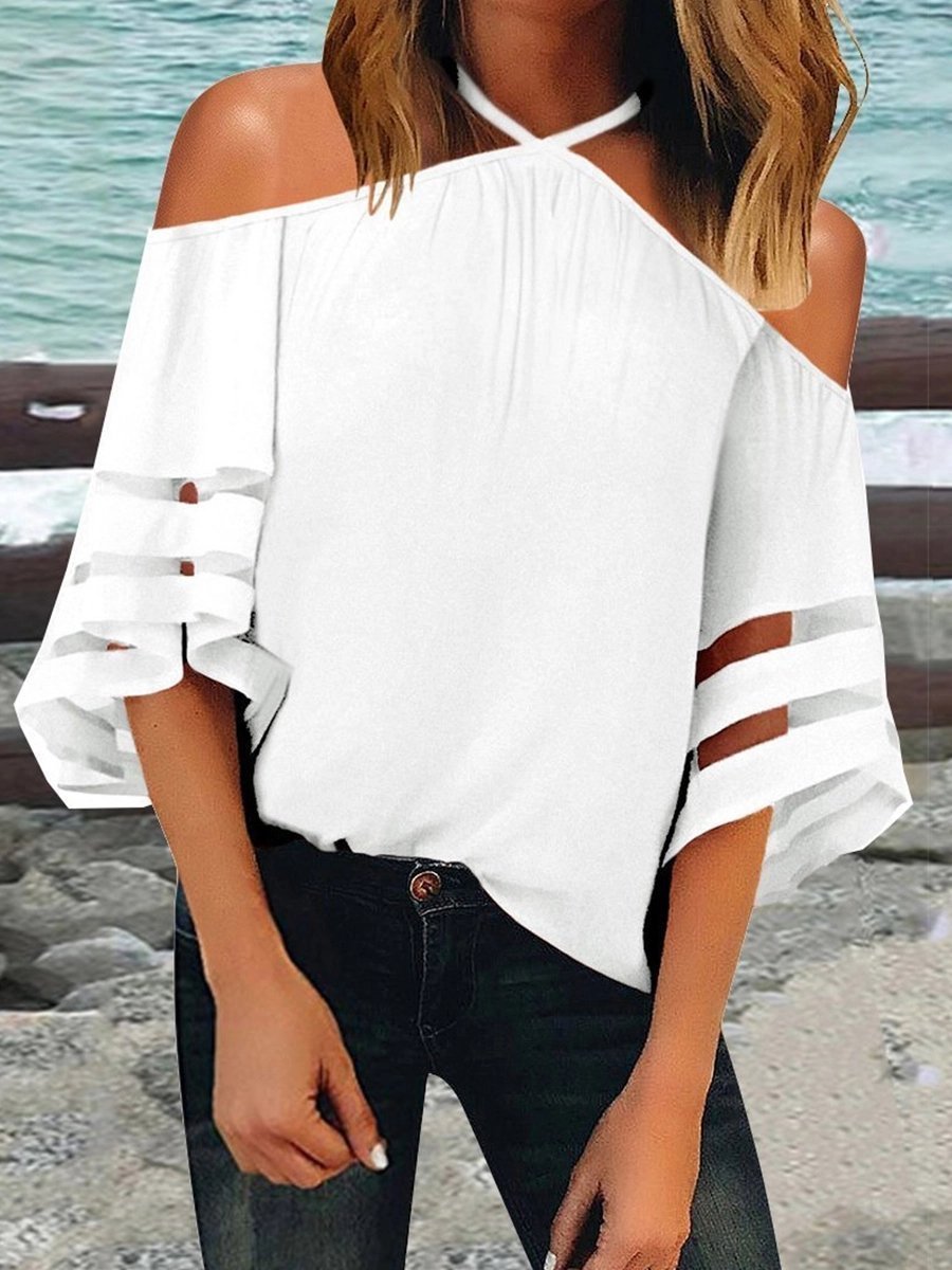 Sexy Halter Strapless Bell Sleeve Stitching Mesh T-Shirts