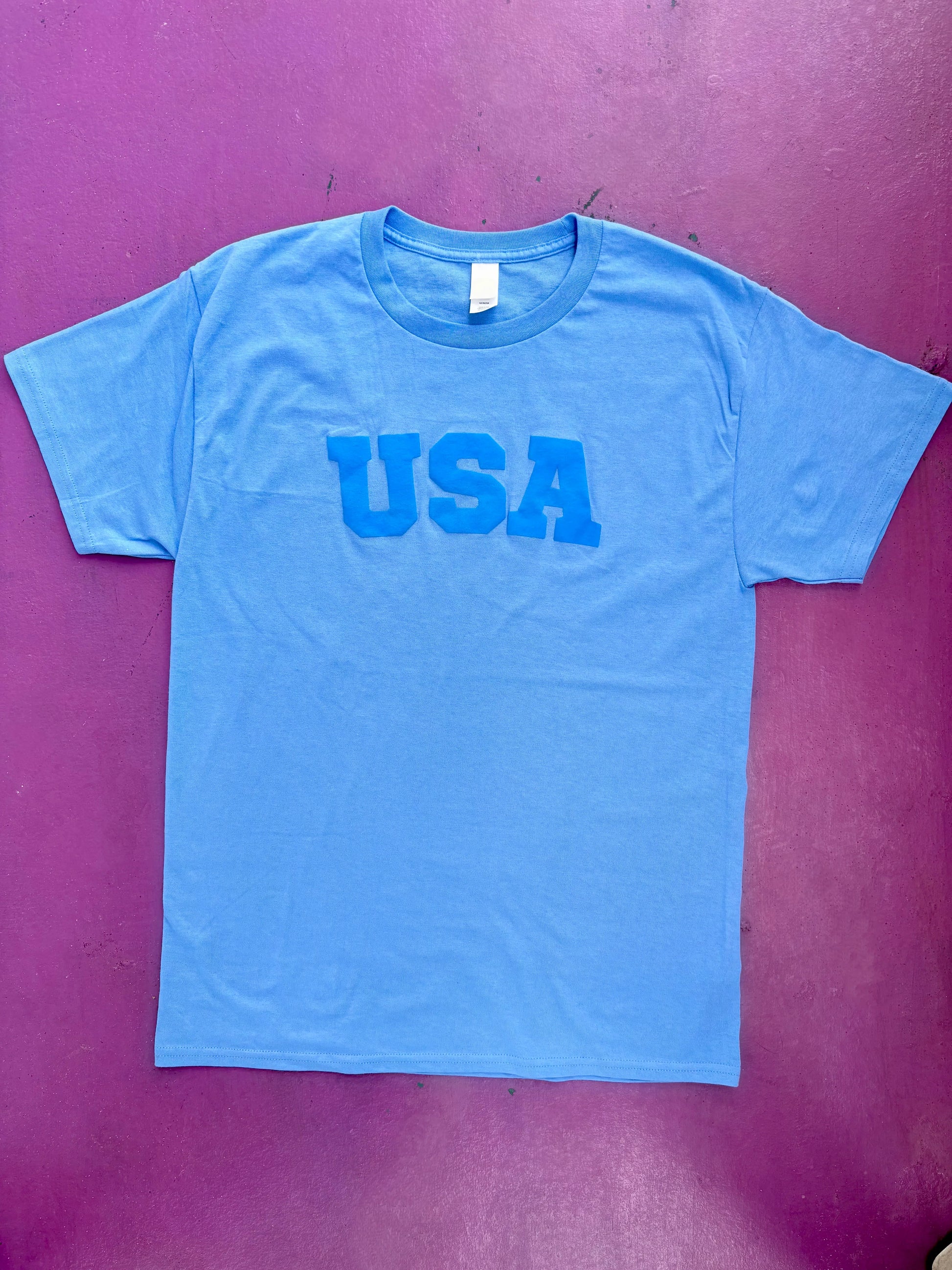 • Blue tee with bold cobalt blue deluxe puffy 'USA' print for a raised, high-quality finish.