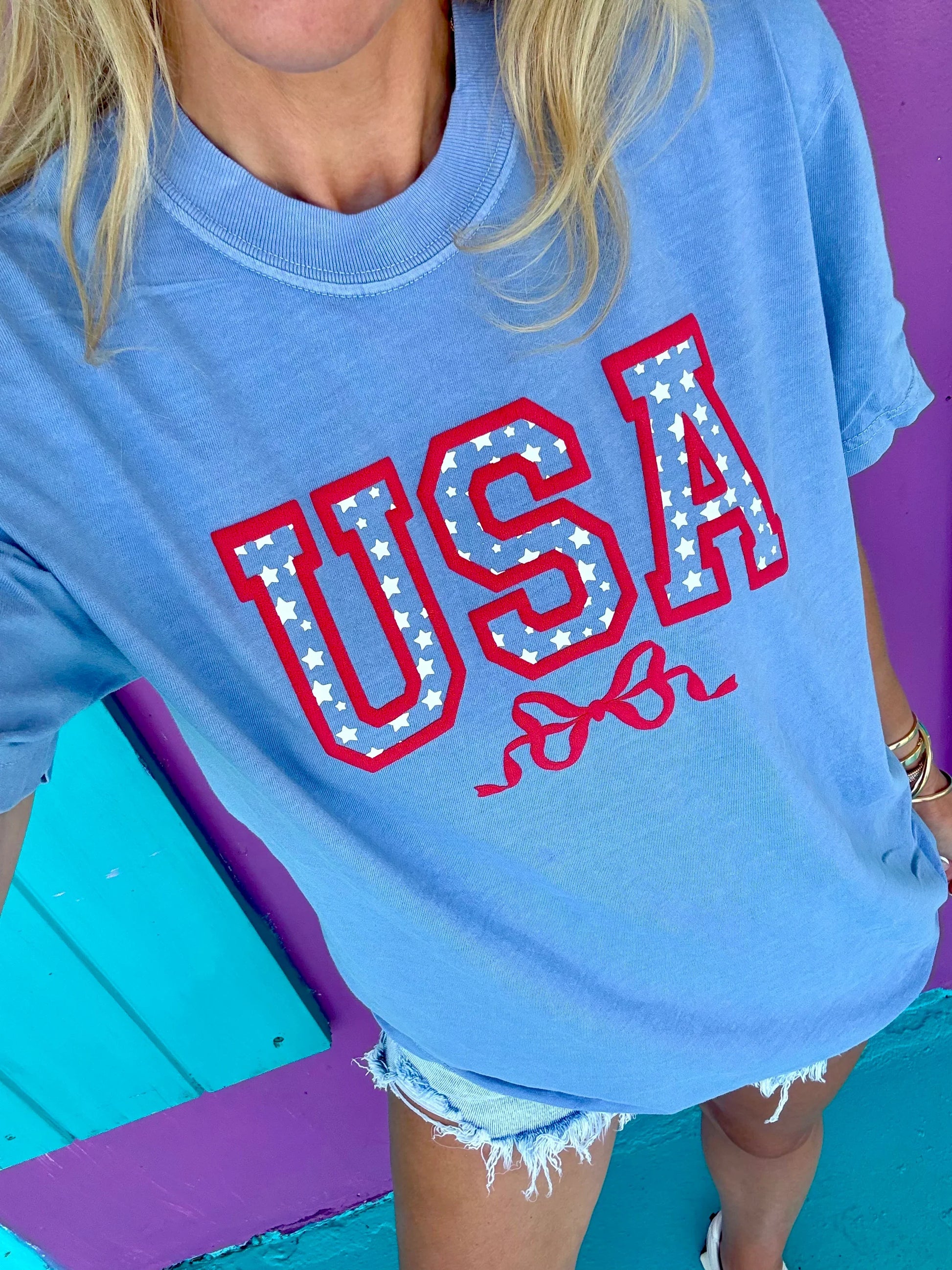 Made from ultra-soft, breathable 100% cotton on a premium Comfort Colors tee, this gorgeous blue shirt features bold red deluxe puffy 'USA' lettering with white stars. The extra-thick puffy print gives it a dimensional, elevated look that feels just as good as it looks.