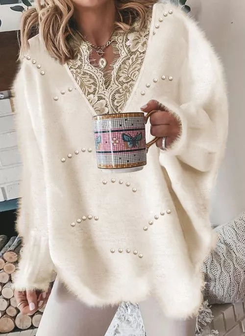 V-neckline Solid Color Casual Lace H-line Sweaters