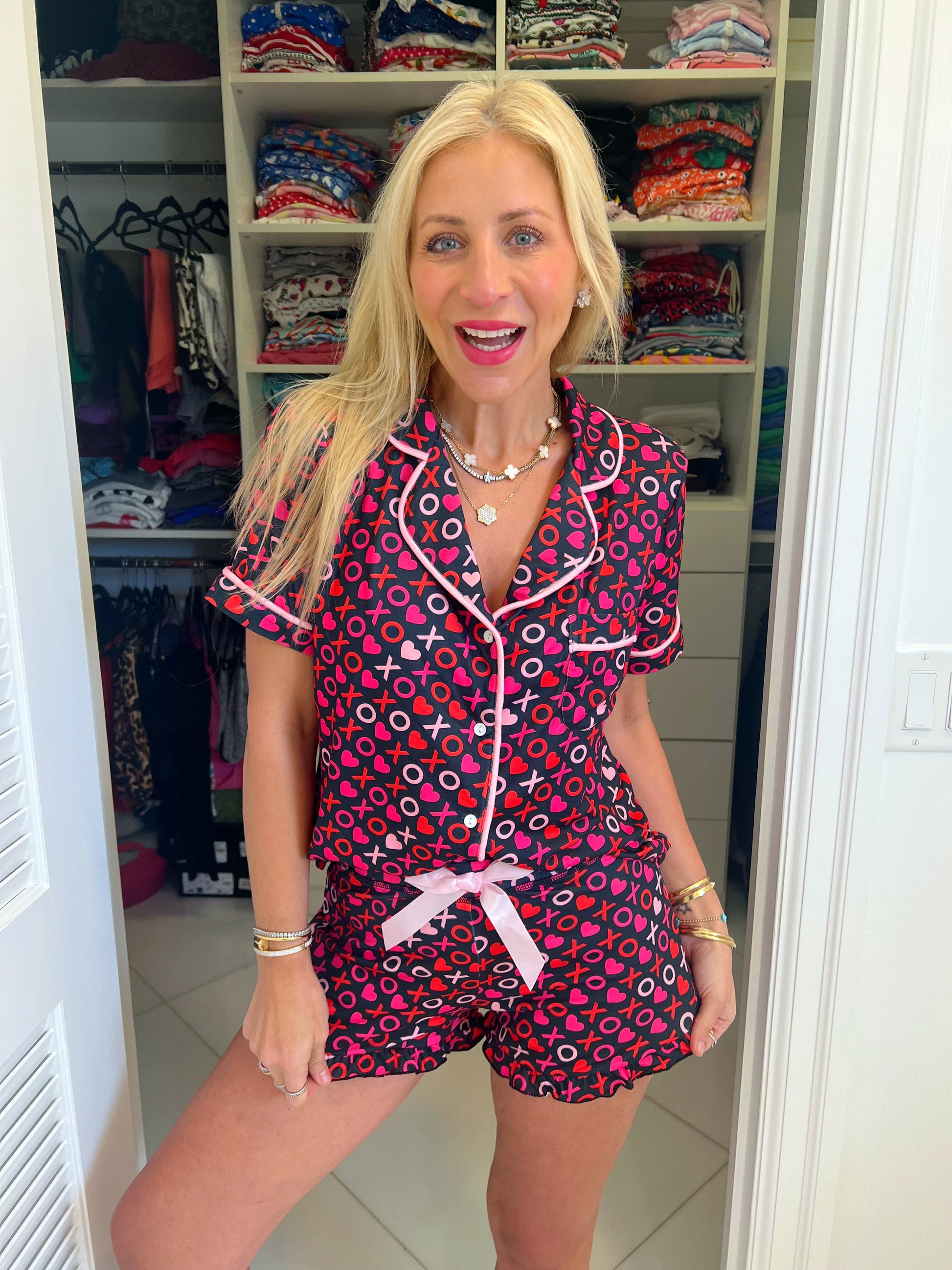 We're all about XO's & Hearts! We had so many requests for more short's sets we just had to make the cutest one ever! These jammies are made in our signature, soft fabric! This set features our short sleeve button down top & our adorable short trim shorts. This set is the perfect pair of pjs to wear to feel cute and comfy!